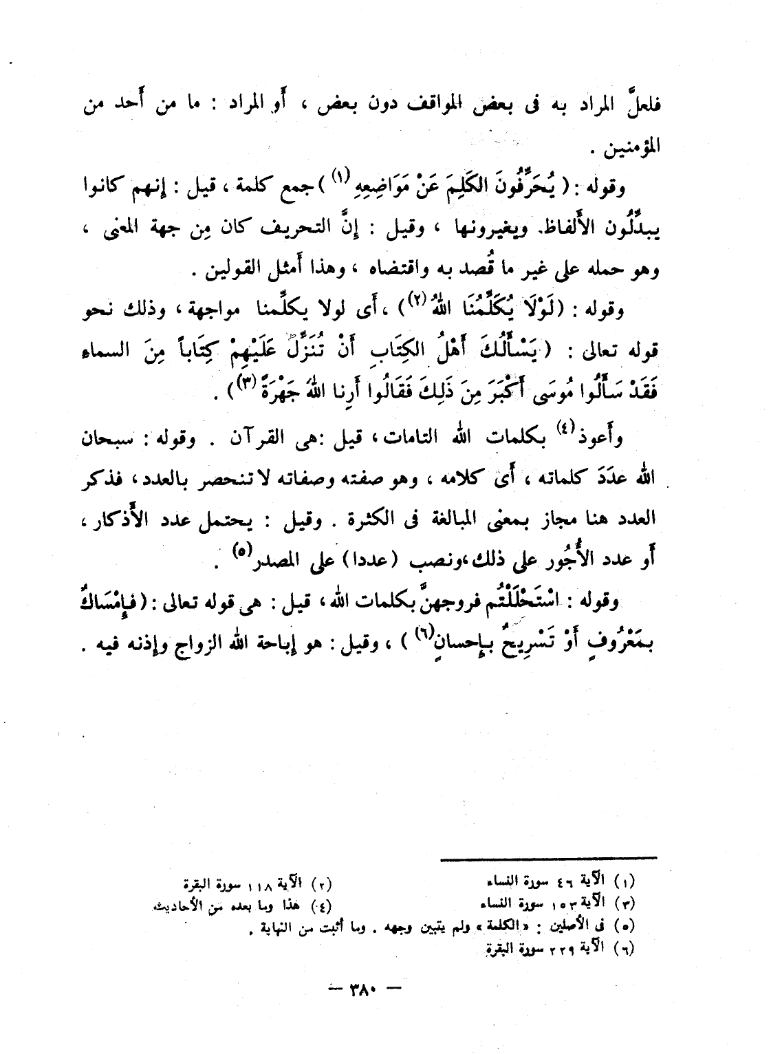 وقوله: اسْتَحْلَلْتُم فروجهنَّ بكلمات الله، قيل: هى قوله تعالى: {فَإِمْسَاكٌ بِمَعْرُوفٍ أَوْ تَسْرِيحٌ بِإِحْسَانٍ} ، وقيل: هو إِباحة الله الزواج وإِذنه فيه.