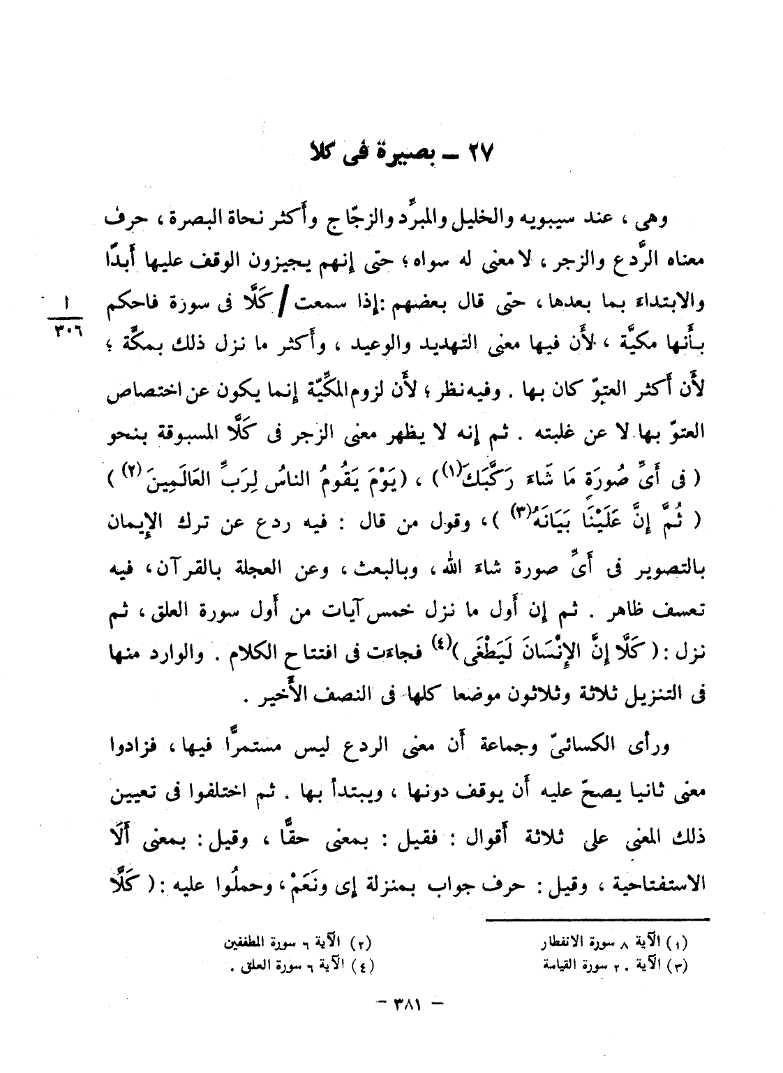 وهى، عند سيبويه والخليل والمبرِّد والزجّاج وأَكثر نحاة البصرة، حرف معناه الرَّدع والزجر، لا معنى له سواه؛ حتى إِنهم يجيزون الوقف عليها أَبداً والابتداءَ بما بعدها، حتى قال بعضهم: إِذا سمعت / كَلاَّ فى سورة فاحكم بأَنها مكيَّة، لأَن فيها معنى التهديد والوعيد، وأَكثر ما نزل ذلك بمكَّة؛ لأَن أَكثر العتوّ كان بها. وفيه نظر؛ لأَن لزوم المكِّيّة إِنما يكون عن اختصاص العتوّ بها لا عن غلبته. ثم إِنه لا يظهر معنى الزجر فى كَلاَّ المسبوقة بنحو {في أَىِّ صُورَةٍ مَّا شَآءَ رَكَّبَكَ} ، {يَوْمَ يَقُومُ الناس لِرَبِّ العالمين} {ثُمَّ إِنَّ عَلَيْنَا بَيَانَهُ} ، وقول من قال: فيه ردع عن ترك الإِيمان بالتصوير فى أَىِّ صورة شاءَ الله، وبالبعث، وعن العجلة بالقرآن، فيه تعسف ظاهر. ثم إِن أَول ما نزل خمس آيات من أَول سورة العلق، ثم نزل: {كَلاَّ إِنَّ الإنسان ليطغى} فجاءَت فى افتتاح الكلام. والوارد منها فى التنزيل ثلاثة وثلاثون موضعا كلها فى النصف الأَخير.