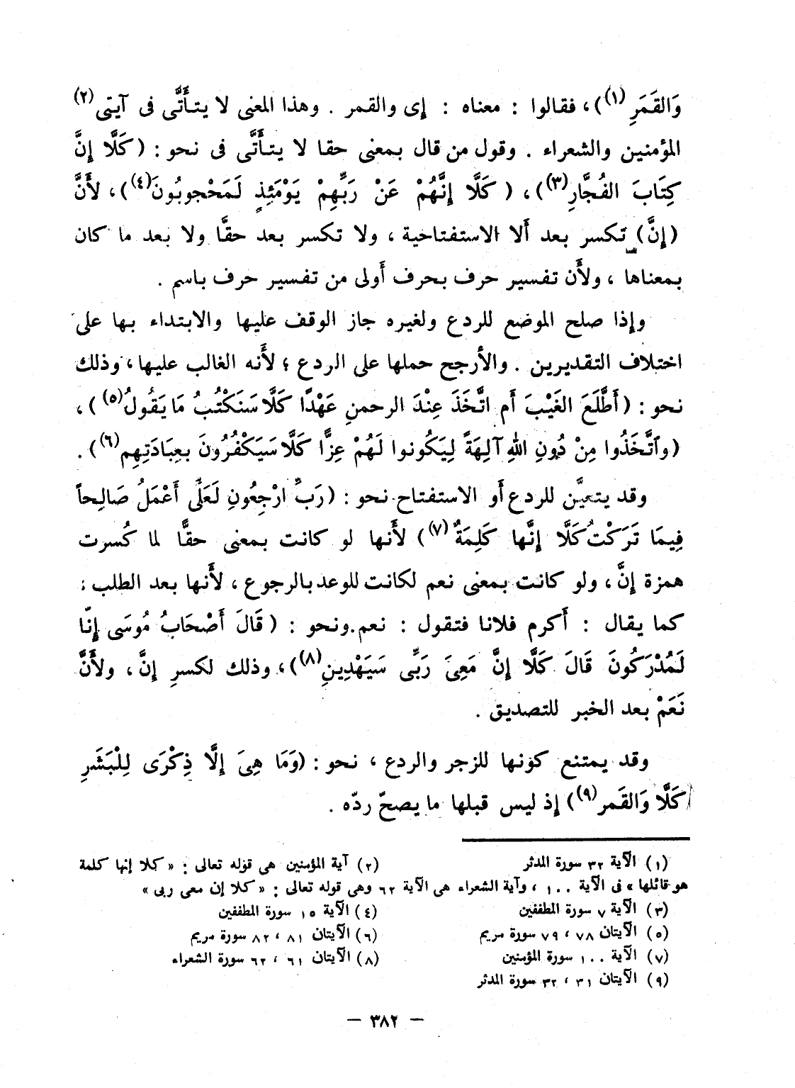 والقمر} ، فقالوا: معناه: إِى والقمر. وهذا المعنى لا يتأَتَّى فى آيتى المؤمنين والشعراء. وقول من قال بمعنى حقا لا يتأَتَّى فى نحو: {كَلاَّ إِنَّ كِتَابَ الفجار} ، {كَلاَّ إِنَّهُمْ عَن رَّبِّهِمْ يَوْمَئِذٍ لَّمَحْجُوبُونَ} ، لأَنَّ (إِنَّ) تكسر بعد أَلا الاستفتاحية، ولا تكسر بعد حقَّا ولا بعد ما كان بمعناها، ولأَن تفسير حرف بحرف أَولى من تفسير حرف باسم.