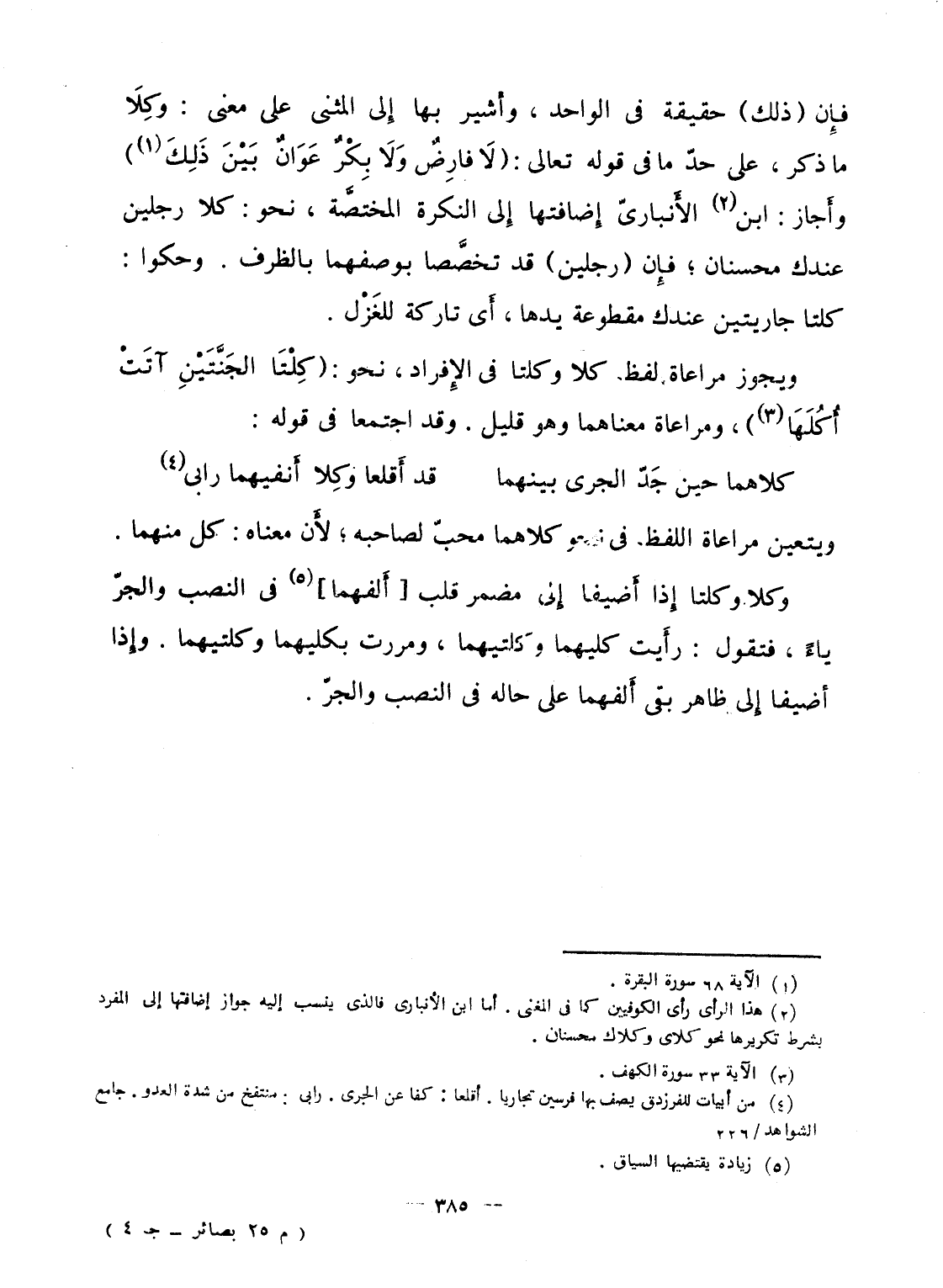 فإِن (ذلك) حقيقة فى الواحد، وأشير بها إِلى المثنى على معنى: وكِلاَ ما ذكر، على حدّ ما فى قوله تعالى: {لاَّ فَارِضٌ وَلاَ بِكْرٌ عَوَانٌ بَيْنَ ذلك} وأَجاز: ابن الأَنبارىّ إِضافتها إِلى النكرة المختصَّة، نحو: كلا رجلين عندك محسنان؛ فإِن (رجلين) قد تخصَّصا بوصفهما بالظرف. وحكوا: كلتا جاريتين عندك مقطوعة يدها، أَى تاركة للغَزْل.