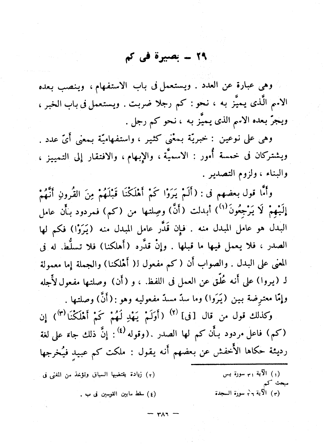 وأَمَّا قول بعضهم فى: {أَلَمْ يَرَوْاْ كَمْ أَهْلَكْنَا قَبْلَهُمْ مِّنَ القرون أَنَّهُمْ إِلَيْهِمْ لاَ يَرْجِعُونَ} أبدلت (أَنَّ) وصِلتها من (كم) فمردود بأَن عامل البدل هو عامل المبدل منه. فإِن قَدَّر عامل المبدل منه (يَرَوْا) فكم لها الصدر، فلا يعمل فيها ما قبلها. وإِنْ قدَّره (أَهلكنا) فلا تسلَّط له فى المعنى على البدل. والصواب أَن (كم مفعول لـ (أَهْلكنا) والجملة إِما معمولة لـ (يروا) على أَنه عُلّق عن العمل فى اللفظ، و (أَن) وصلتها مفعول لأَجله وإِمّا معترِضة بين (يَرَوا) وما سدّ مسدّ مفعوليه وهو: (أَنَّ) وصلتها.