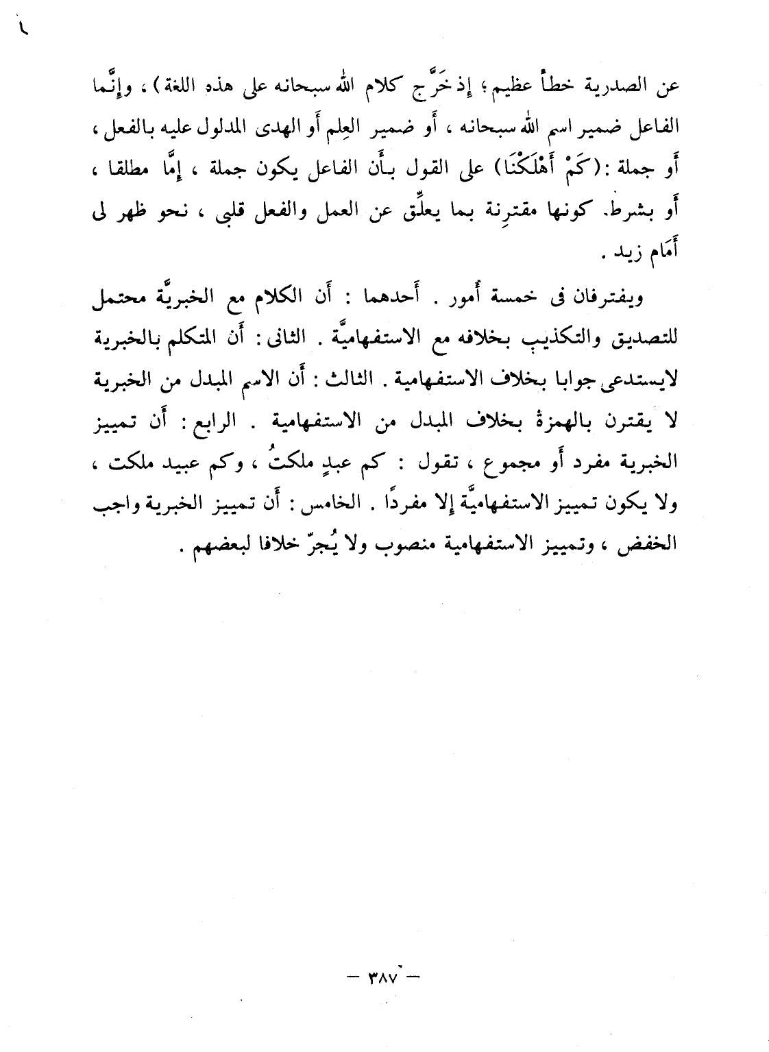 عن الصدرية خطأ عظيم؛ إِذا خَرَّج كلام الله سبحانه على هذه اللغة) ، وإِنَّما الفاعل ضمير اسم الله سبحانه، أَو ضمير العِلم أَو الهدى المدلول عليه بالفعل، أَو جملة: {كَمْ أَهْلَكْنَا} على القول بأَن الفاعل يكون جملة، إِمَّا مطلقا، أَو بشرط كونها مقترِنة بما يعلِّق عن العمل والفعل قلبى، نحو ظهر لى أَمَام زيد.