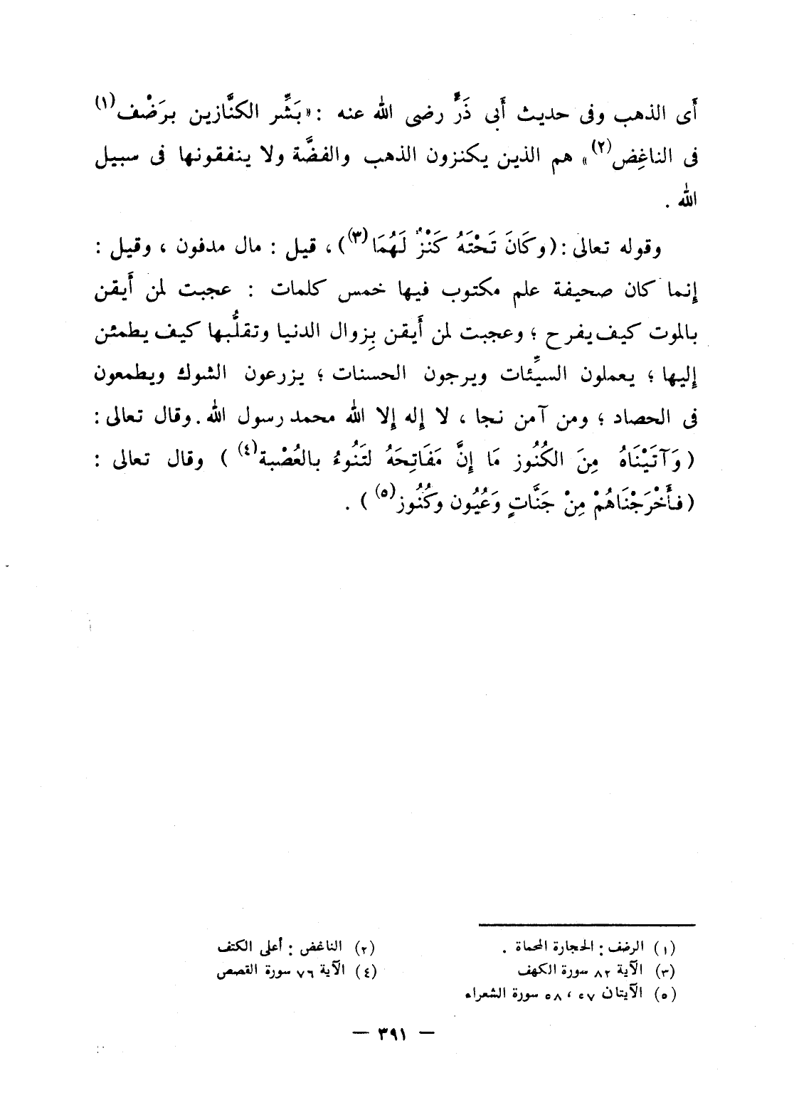 وقوله تعالى: {وَكَانَ تَحْتَهُ كَنزٌ لَّهُمَا} ، قيل: مال مدفون، وقيل: إِنما كان صحيفة علم مكتوب فيها خمس كلمات: عجبت لمن أَيقن بالموت كيف يفرح؛ وعجبت لمن أَيقن بِزوال الدنيا وتقلُّبها كيف يطمئن إِليها؛ يعملون السيِّئات ويرجون الحسنات؛ يزرعون الشوك ويطمعون فى الحصاد؛ ومن آمن نجا، لا إِله إِلا الله محمد رسول الله. وقال تعالى: {وَآتَيْنَاهُ مِنَ الكنوز مَآ إِنَّ مَفَاتِحَهُ لَتَنُوءُ بالعصبة} وقال تعالى: {فَأَخْرَجْنَاهُمْ مِّن جَنَّاتٍ وَعُيُونٍ وَكُنُوزٍ} .