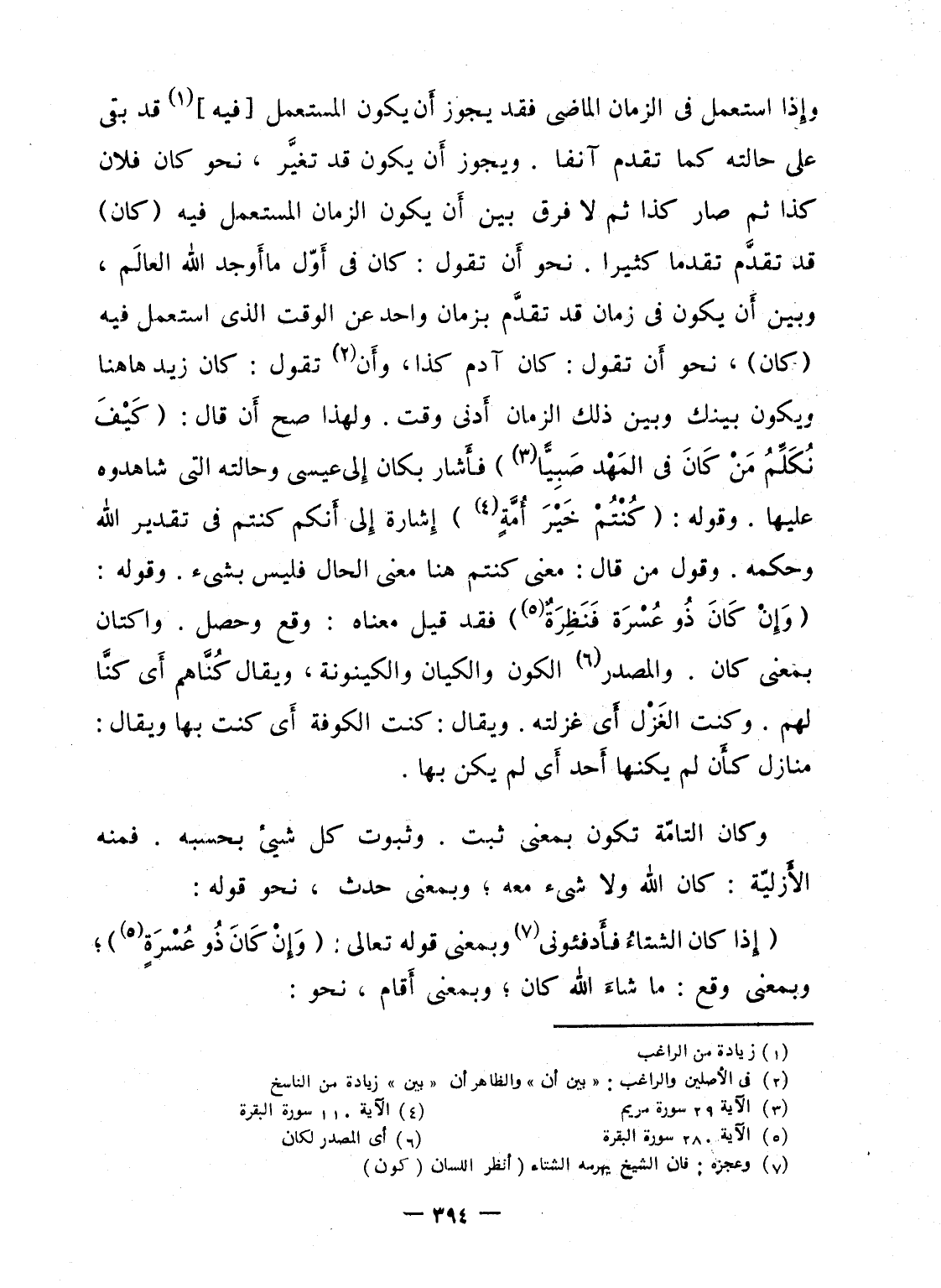 وإِذا استعمل فى الزمان الماضى فقد يجوز أَن يكون المستعمل [فيه] قد بقى على حالته كما تقدم آنفا. ويجوز أَن يكون قد تغيَّر، نحو كان فلان كذا ثم صار كذا ثم لا فرق بين أَن يكون الزمان المستعمل فيه (كان) قد تقدَّم تقدما كثيرا. نحو أَن تقول: كان فى أَوّل ما أَوجد الله العالَم، وبين أَن يكون فى زمان قد تقدَّم بزمان واحد عن الوقت الذى استعمل فيه (كان) ، نحو أن تقول: كان آدم كذا، وأَن تقول: كان زيد هاهنا ويكون بينك وبين ذلك الزمان أَدنى وقت. ولهذا صح أَن قال: {كَيْفَ نُكَلِّمُ مَن كَانَ فِي المهد صَبِيّاً} فأَشار بكان إِلى عيسى وحالته التى شاهدوه عليها. وقوله: {كُنْتُمْ خَيْرَ أُمَّةٍ} إِشارة إِلى أَنكم كنتم فى تقدير الله وحكمه. وقول من قال: معنى كنتم هنا معنى الحال فليس بشىء. وقوله: {وَإِن كَانَ ذُو عُسْرَةٍ فَنَظِرَةٌ} فقد قيل معناه: وقع وحصل. واكتان بمعنى كان. والمصدر الكون والكيان والكينونة، ويقال كُنَّاهم أَى كنَّا لهم. وكنت الغَزْل أَى غزلته. ويقال: كنت الكوفة أَى كنت بها ويقال: منازل كأَن لم يكنها أَحد أَى لم يكن بها.