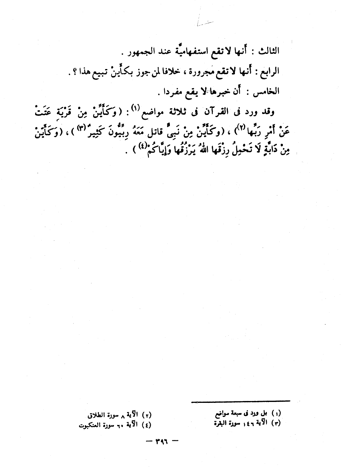 وقد ورد فى القرآن فى ثلاثة مواضع: {وَكَأِيِّن مِّن قَرْيَةٍ عَتَتْ عَنْ أَمْرِ رَبِّهَا} ، {وَكَأَيِّن مِّن نَّبِيٍّ قَاتَلَ مَعَهُ رِبِّيُّونَ كَثِيرٌ} ، {وَكَأَيِّن مِّن دَآبَّةٍ لاَّ تَحْمِلُ رِزْقَهَا الله يَرْزُقُهَا وَإِيَّاكُمْ} .