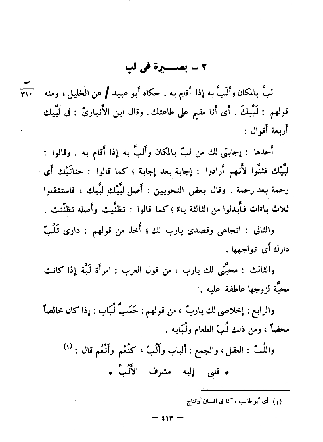 أَحدها: إِجابتى لك من لبّ بالمكان وأَلبَّ به أَقام به. وقالوا: لبَّيْك فثنَّوا لأَنهم أَرادوا: إِجابة بعد إِجابة؛ كما قالوا: حنانَيْك أَى رحمة بعد رحمة. وقال بعض النحويين: أَصل لبَّيْك لبَّبك، فاستثقلوا ثلاثة باءَات فأَبدلوا من الثالثة ياءً؛ كما قالوا: تظنَّيت وأَصله تظّننت.