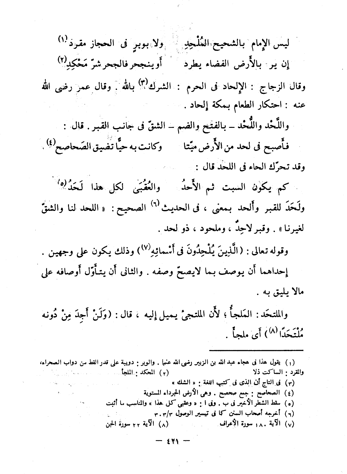 وقال الزجاج: الإِلحاد فى الحرم: الشرك بالله. وقال عمر رضى الله عنه: احتكار الطعام بمكة إِلحاد.