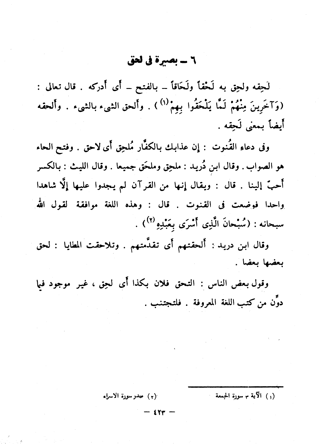وفى دعاءِ القُنوت: إِن عذابك بالكفَّار مُلحِق أَى لاحق. وفتح الحاء هو الصواب. وقال ابن دُريد: ملحِق وملحَق جميعا. وقال الليث: بالكسر أَحبّ إِلينا. قال: ويقال إِنها من القرآن لم يجدوا عليها إِلاَّ شاهدا واحدا فوضعت فى القنوت. قال: وهذه اللغة موافقة لقول الله سبحانه: {سُبْحَانَ الذي أسرى بِعَبْدِهِ} .