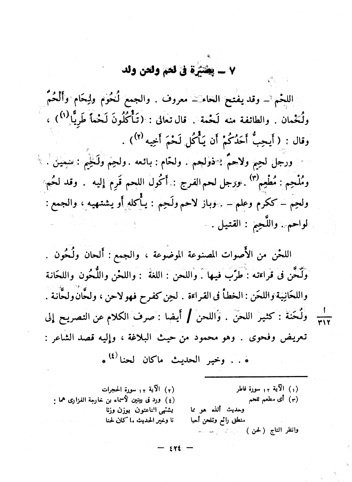 اللحْم - وقد يفتح الحاء - معروف. والجمع لُحُوم ولِحَام وأَلْحُمٌ ولُحْمان. والطائفة منه لَحْمة. قال تعالى: {تَأْكُلُونَ لَحْماً طَرِيّاً} ، وقال: {أَيُحِبُّ أَحَدُكُمْ أَن يَأْكُلَ لَحْمَ أَخِيهِ} .