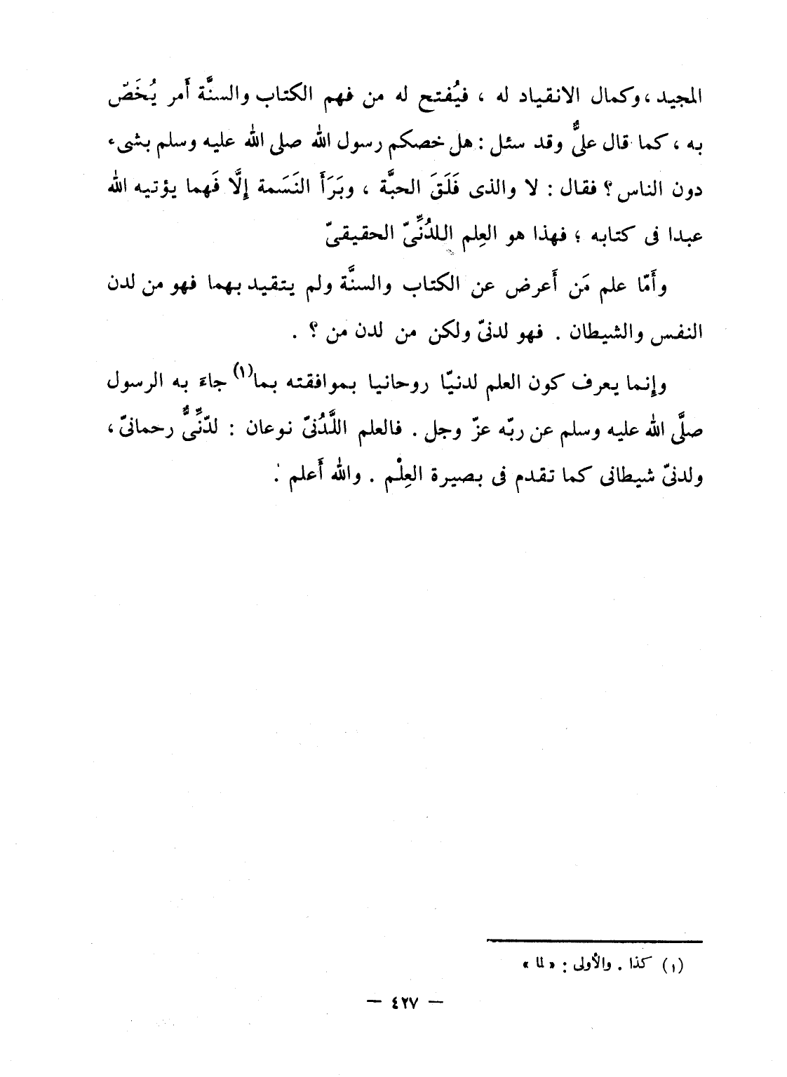 وأَمّا علم مَن أَعرض عن الكتاب والسنَّة ولم يتقيد بهما فهو من لدن النفس والشيطان. فهو لدنىّ ولكن من لدن من؟.