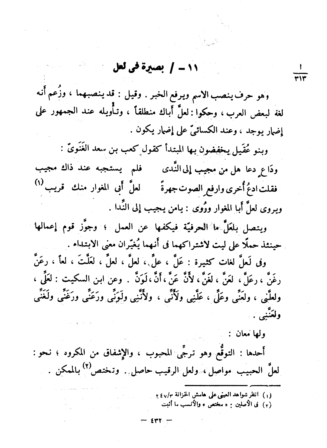 أَحدها: التوقُّع وهى ترجِّى المحبوب، والإِشفاق من المكروه؛ نحو: لعلَّ الحبيب مواصل، ولعل الرقيب حاصل. وتختص بالممكن.