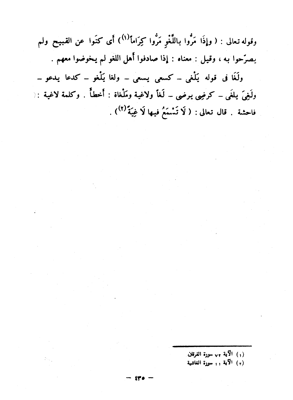 وقوله تعالى: {وَإِذَا مَرُّواْ بِاللَّغْوِ مَرُّوا كِراماً} أَى كنَوا عن القبيح ولم يصرّحوا به، وقيل: معناه: إِذا صادفوا أَهل اللغو لم يخوضوا معهم.