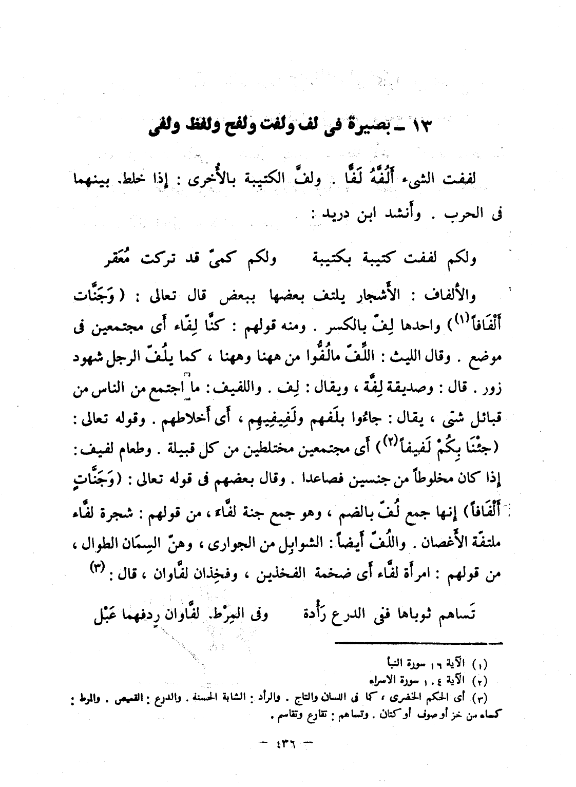 والألفاف: الأَشجار يلتف بعضها ببعض قال تعالى: {وَجَنَّاتٍ أَلْفَافاً} واحدها لِفّ بالكسر. ومنه قولهم: كنَّا لِفّاء أَى مجتمعين فى موضع. وقال الليث: اللِّفّ مالُفُّوا من ههنا وههنا، كما يلُفّ الرجل شهود زور. قال: وصديقة لِفَّة، ويقال: لِف. واللفيف: ما اجتمع من الناس من قبائل شتى، يقال: جاءُوا بلَفهم ولَفِيفِيهِم، أَى أخلاطهم. وقوله تعالى: {جِئْنَا بِكُمْ لَفِيفاً} أَى مجتمعين مختلطين من كل قبيلة. وطعام لفيف: إِذا كان مخلوطاً من جنسين فصاعدا. وقال بعضهم فى قوله تعالى: {وَجَنَّاتٍ أَلْفَافاً} إِنها جمع لُفّ بالضم، وهو جمع جنة لفَّاءَ، من قولهم: شجرة لفَّاء ملتفّة الأَغصان. واللُفّ أَيضاً: الشوابِل من الجوارى، وهنّ السِمَان الطوال، من قولهم: امرأَة لفَّاء أَى ضخمة الفخذين، وفخِذان لفَّاوان، قال: