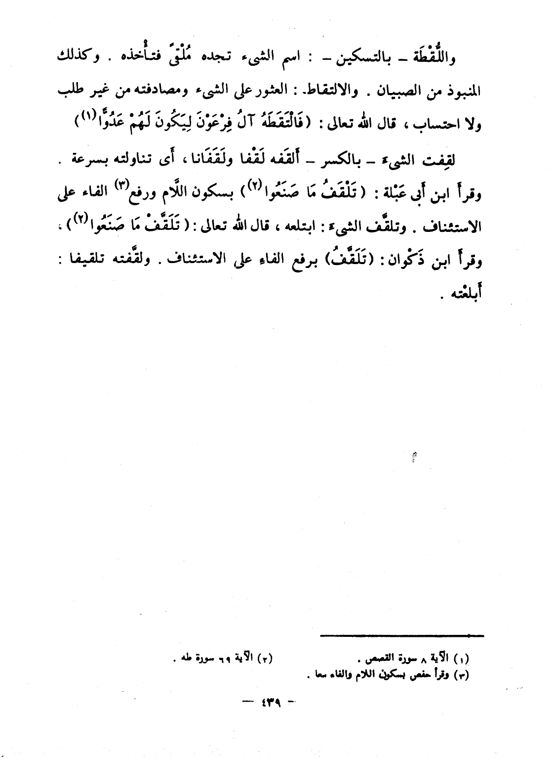 لقِفت الشىءَ - بالكسر- أَلقَفه لَقْفا ولَقَفَانا، أَى تناولته بسرعة. وقرأَ ابن أَبى عَبْلة: {تَلْقَفْ مَا صنعوا} بسكون اللاَّم ورفع الفاء على الاستئناف. وتلقَّف الشىءَ: ابتلعه، قال الله تعالى: {تَلْقَفْ مَا صنعوا} ، وقرأَ ابن ذَكْوان: (تَلَقَّفُ) برفع الفاءِ على الاستئناف. ولقَّفته تلقيفا: أَبلعْته.