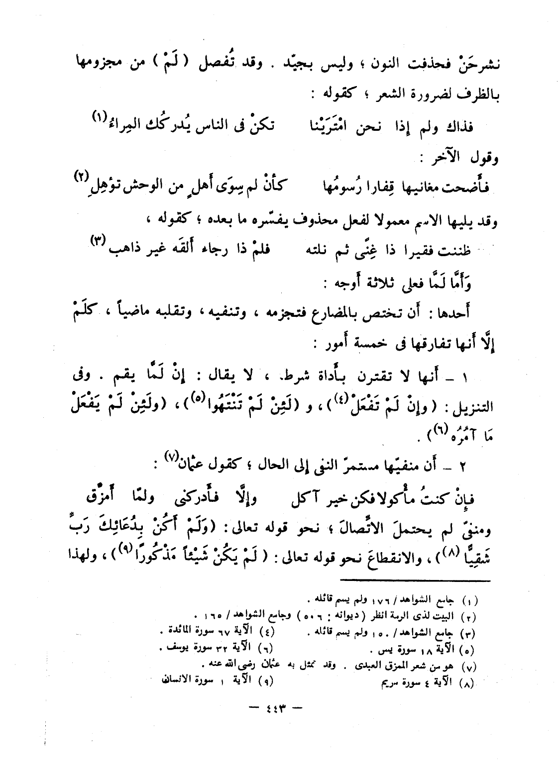 أَحدها: أَن تختص بالمضارع فتجزمه، وتنفيه، وتقلبه ماضياً، كلَمْ إِلاَّ أَنها تفارقها فى خمسة أَمور:
