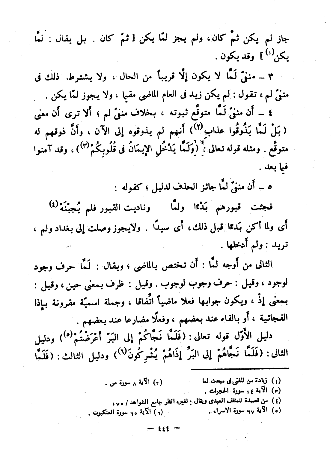 3- منفىّ لَمَّا لا يكون إِلاَّ قريباً من الحال، ولا يشترط ذلك فى منفىّ لم، تقول: لم يكن زيد فى العام الماضى مقيما، ولا يجوز لمّا يكن.
