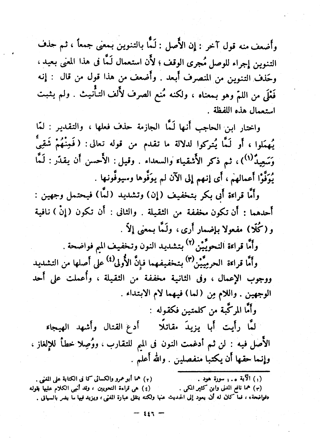 واختار ابن الحاجب أَنها لَمَّا الجازمة حذف فعلها، والتقدير: لمّا يُهمَلوا، أَو لَمَّا يُتركوا لدلالة ما تقدم من قوله تعالى: {فَمِنْهُمْ شَقِيٌّ وَسَعِيدٌ} ، ثم ذكر الأَشقياءَ والسعداء. وقيل: الأَحسن أَن يقدّر: لَمَّا يُوَفَّوْا أَعمالهم، أَى إنهم إِلى الآن لم يوَفَّوها وسيوفَّونها.