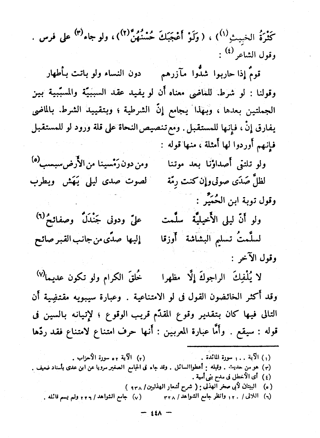 وقد أَكثر الخائضون القول فى لو الامتناعية. وعبارة سيبويه مقتضِية أَن التالى فيها كان بتقدير وقوع المقدّم قريب الوقوع؛ لإِتيانه بالسين فى قوله: سيقع. وأَمَّا عبارة المعربين: أَنها حرف امتناع لامتناع فقد ردّها