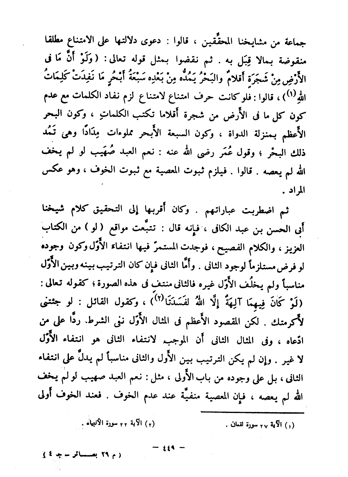 جماعة من مشايخنا المحقِّقين، قالوا: دعوى دلالتها على الامتناع مطلقا منقوضة بمالا قِبَل به. ثم نقضوا بمثل قوله تعالى: {وَلَوْ أَنَّمَا فِي الأرض مِن شَجَرَةٍ أَقْلاَمٌ والبحر يَمُدُّهُ مِن بَعْدِهِ سَبْعَةُ أَبْحُرٍ مَّا نَفِدَتْ كَلِمَاتُ الله} ، قالوا: فلو كانت حرف امتناع لامتناع لزم نفاد الكلمات مع عدم كون كل ما فى الأَرض من شجرة أَقلاما تكتب الكلماتِ، وكون البحر الأَعظم بمنزلة الدواة، وكون السبعة الأَبحر مملوءات مِدَاداً وهى تَمُد ذلك البحْر؛ وقول عُمَر رضى الله عنه: نعم العبد صُهَيب لو لم يخف الله لم يعصه. قالوا. فيلزم ثبوت المعصية مع ثبوت الخوف، وهو عكس المراد.