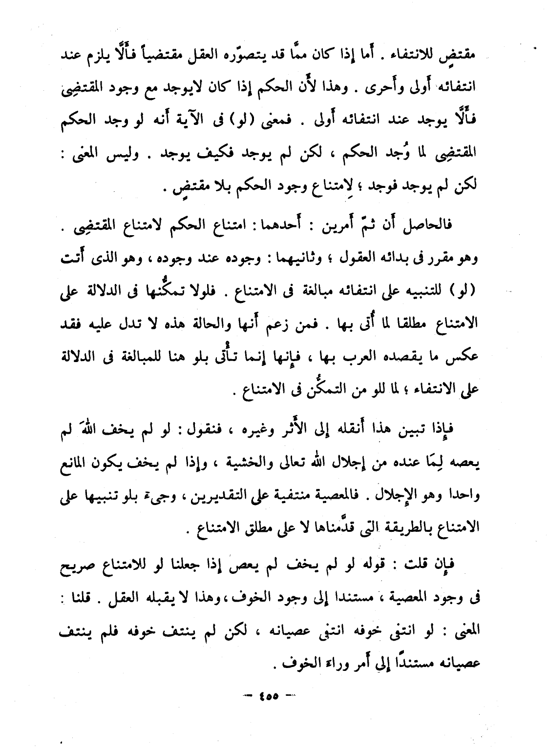 مقتضٍ للانتفاء. أَما إِذا كان ممَّا قد يتصوّره العقل مقتضياً فألاَّ يلزم عند انتفائه أَولى وأَحرى. وهذا لأَن الحكم إِذا كان لا يوجد مع وجود المقتضِى فأَلاَّ يوجد عند انتفائه أَولى. فمعنى (لو) فى الآية أَنه لو وجد الحكم المقتضِى لما وُجد الحكم، لكن لم يوجد فكيف يوجد. وليس المعنى: لكن لم يوجد فوجد؛ لاِمتناع وجود الحكم بلا مقتضٍ.