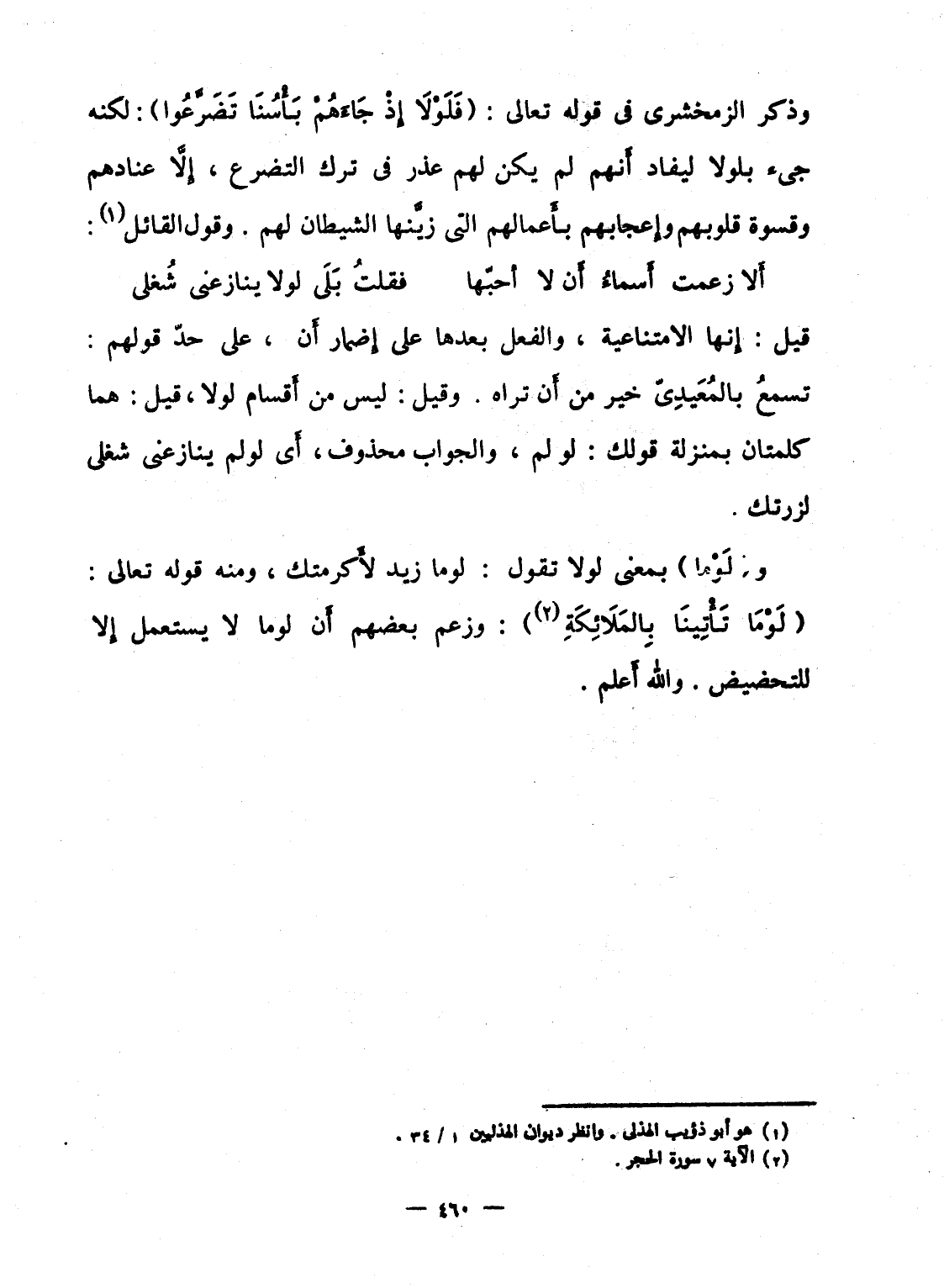 وذكر الزمخشرى فى قوله تعالى: {فلولا إِذْ جَآءَهُمْ بَأْسُنَا تَضَرَّعُواْ} : لكنه جئ بلولا ليفاد أَنهم لم يكن لهم عذر فى ترك التضرع، إِلاَّ عنادهم وقسوة قلوبهم وإِعجابهم بأَعمالهم التى زيَّنها الشيطان لهم. وقول القائل: