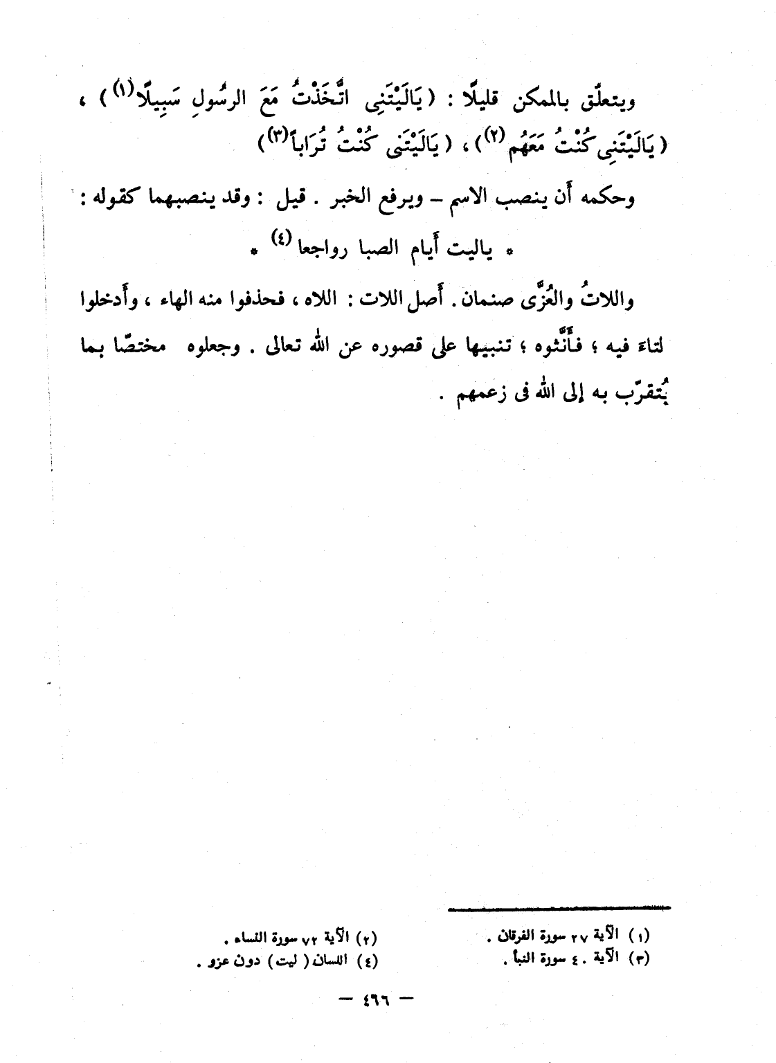 واللاتُ والعُزَّى صنمان. أَصل اللات: اللاه، فحذفوا منه الهاء، وأَدخلوا التاءَ فيه؛ فأَنَّثوه؛ تنبيها على قصوره عن الله تعالى. وجعلوه مختصّا بما يُتقرّب به إلى الله فى زعمهم.