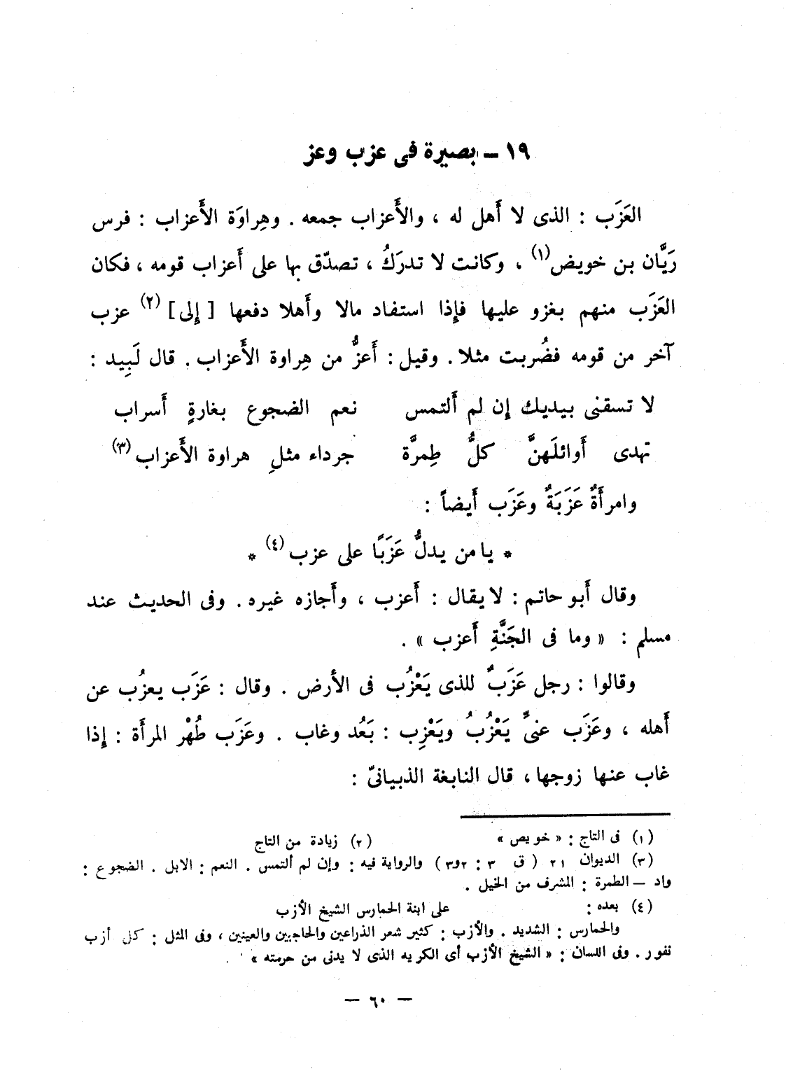 وقالوا: رجل عَزَبٌ للذى يَعْزُب فى الأرض. وقال: عَزَب يعزُب عن أَهله، وعَزَب عنىِّ يَعْزُبُ ويَعْزِب: بَعُد وغاب. وعَزَب طُهْر المرأَة: إِذا غاب عنها زوجها، قال النابغة الذبيانىّ: