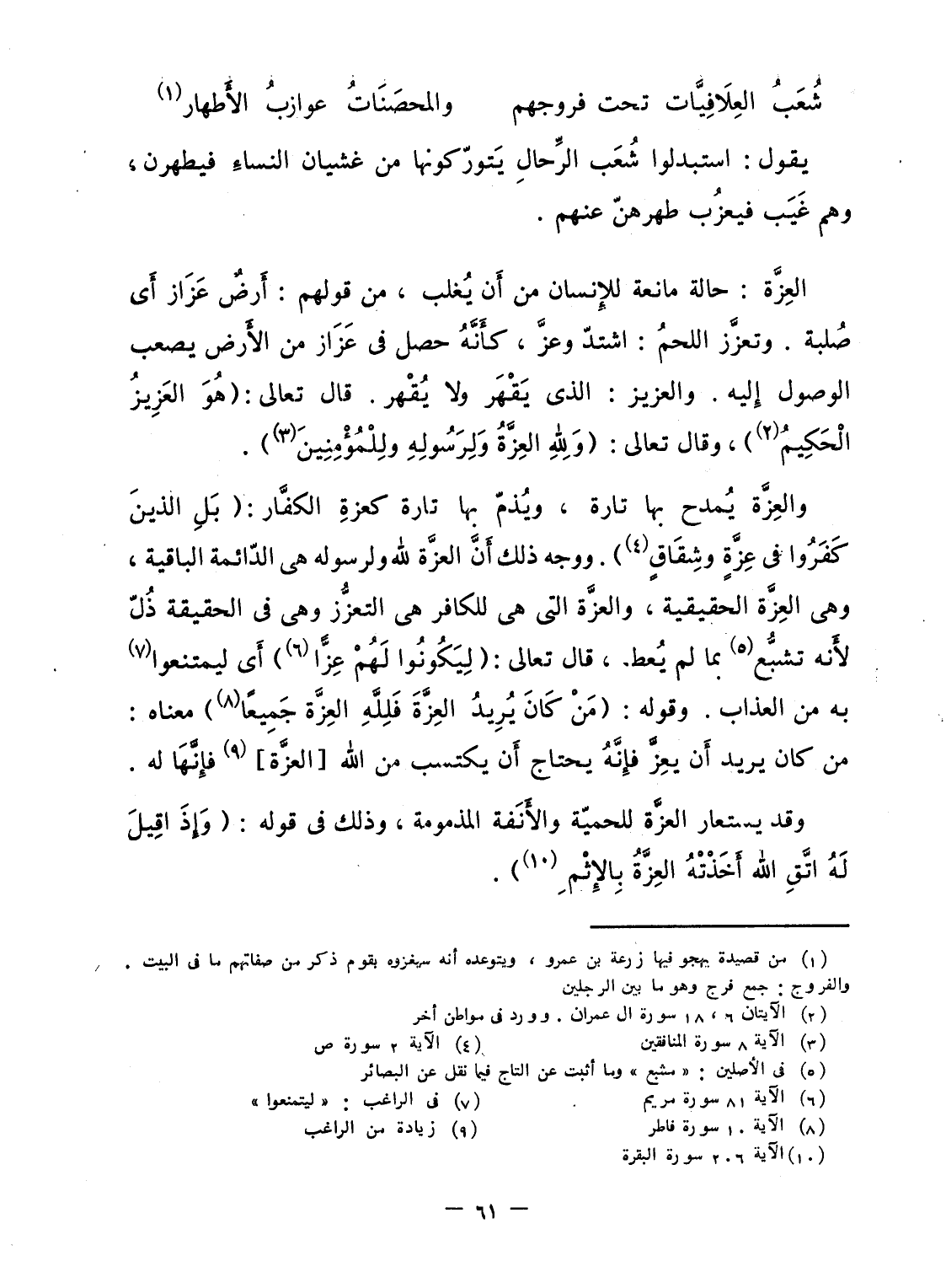 والعِزَّة يُمدح بها تارة، ويُذمّ بها تارة كعزِة الكفَّار: {بَلِ الذين كَفَرُواْ فِي عِزَّةٍ وَشِقَاقٍ} . ووجه ذلك أَنَّ العزَّة لله ولرسوله هى الدّائمة الباقية، وهى العِزَّة الحقيقية، والعزَّة التى هى للكافر هى التعزُّز وهى فى الحقيقة ذُلّ لأَنه تشبُّع بما لم يُعط، قال تعالى: {لِّيَكُونُواْ لَهُمْ عِزّاً} أَى ليمتنعوا به من العذاب. وقوله: {مَن كَانَ يُرِيدُ العزة فَلِلَّهِ العزة جَمِيعاً} معناه: من كان يريد أَن يعِزَّ فإِنَّهُ يحتاج أَن يكتسب من الله [العزَّة] فإِنَّهَا له.