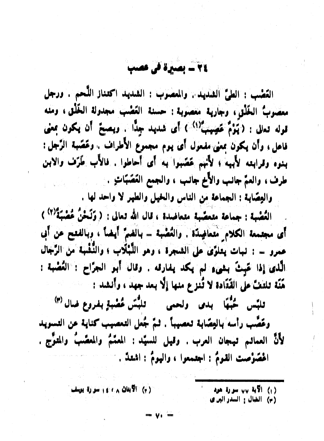العُصْبة: جماعة متعصّبة متعاضدة، قال الله تعالى: {وَنَحْنُ عُصْبَةٌ} أَى مجتمعة الكلامِ متعاضِدَة. والعُصْبة - بالضمّ أَيضاً، وبالفتح عن أَبى عمرو -: نبات يتلوّى على الشجرة، وهو اللَّبْلاَب؛ والنُّشْبة من الرّجال الَّذى إِذا عَبِثَ بشىءٍ لم يكد يفارقه. وقال أَبو الجرّاح: العُصْبة: هَنَة تلتفّ على القَتَادة لا تُنزع منها إِلاَّ بعد جهد، وأَنشد: