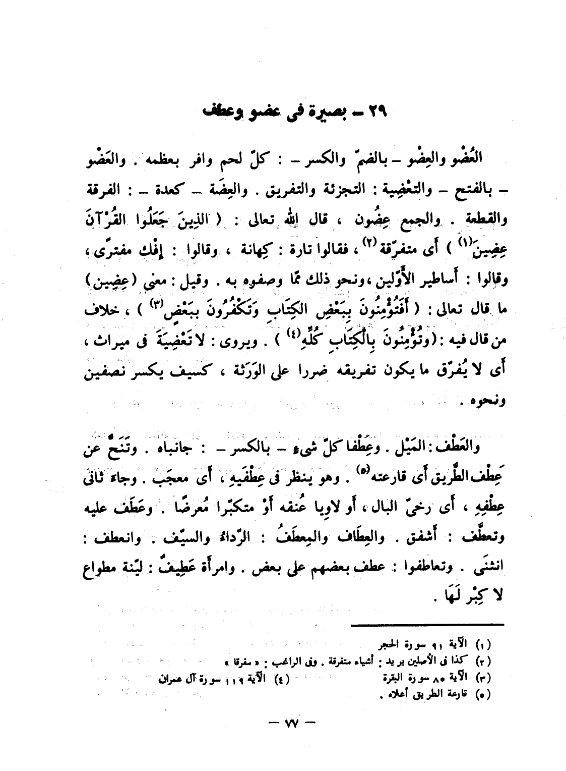 العُضْو والعِضْو - بالضمّ والكسر -: كلّ لحم وافر بعظمه. والعَضْو - بالفتح - والتعْضِية: التجزئة والتفريق. والعِضَة - كعدة -: الفرقة والقطعة. والجمع عِضُون، قال الله تعالى: {الذين جَعَلُواْ القرآن عِضِينَ} أَى متفرّقة، فقالوا تارة: كِهانة، وقالوا: إِفْك مفترًى، وقالوا: أَساطير الأَوّلين، ونحو ذلك ممّا وصفوه به. وقيل: معنى (عِضِين) ما قال تعالى: {أَفَتُؤْمِنُونَ بِبَعْضِ الكتاب وَتَكْفُرُونَ بِبَعْضٍ} ، خلاف من قال فيه: {وَتُؤْمِنُونَ بالكتاب كُلِّهِ} . ويروى: لا تَعْضِيَةَ فى ميراث، أَى لا يُفرّق ما يكون تفريقه ضررا على الوَرَثة، كسيف يكسر نصفين ونحوه.