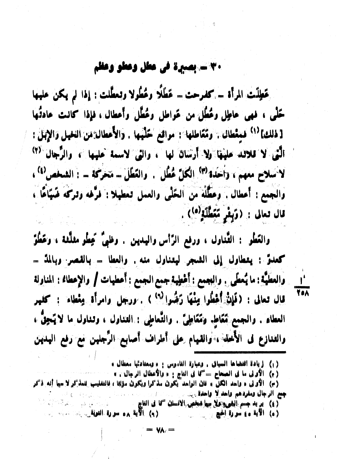 عَطِلَت المرأَة - كفرحت - عَطَلاً وعُطُولا وتعطَّلت: إِذا لم يكن عليها حَلْى، فهى عاطِل وعُطُل من عَواطل وعُطَّل وأَعطال، فإِذا كانت عادتُها [ذلك] فمِعْطال. ومَعَاطلها: مواقع حَلْيها. والأَعطال من الخيل والإِبل: الَّتى لا قلائد عليها ولا أَرسان لها، والتى لاسمة عليها، والرِّجال لا سلاح معهم، واحدة الكلّ عُطُل. والعَطَل - محركة -: الشخص، والجمع: أَعطال. وعطَّله من الحَلْى والعمل تعطيلا: فرَّغه وتركه ضَيَاعًا، قال تعالى: {وَبِئْرٍ مُّعَطَّلَةٍ} .