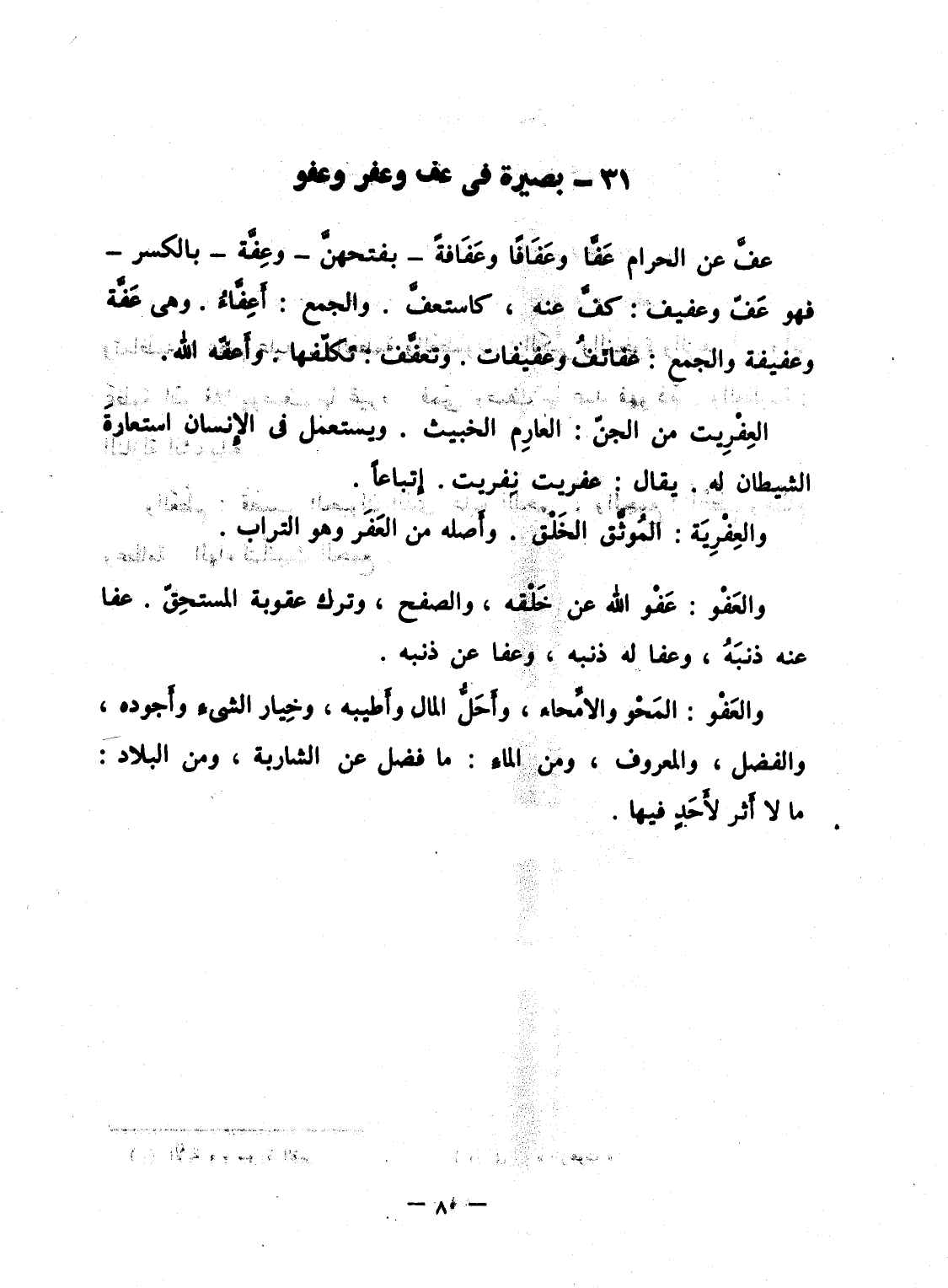 والعَفْو: المَحْو والامِّحاء، وأَحَلُّ المال وأَطيبه، وخِيار الشىءِ وأَجوده، والفضل، والمعروف، ومن الماءِ: ما فضل عن الشاربة، ومن البلاد: ما لا أَثر لأَحَدٍ فيها.
