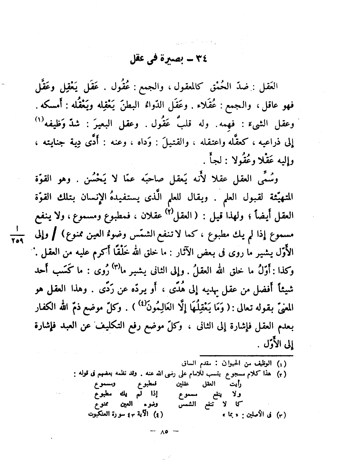 وسُمِّى العقل عقلا لأَنه يَعقل صاحبَه عمّا لا يَحْسُن. وهو القوّة المتهيّئة لقبول العلم. ويقال للعلم الَّذى يستفيدهُ الإِنسان بتلك القوّة العقل أَيضاً؛ ولهذا قيل: (العقل عقلان، فمطبوع ومسموع، ولا ينفع مسموع إِذا لم يك مطبوع، كما لا تنفع الشمّس وضوءُ العين ممنوع) / وإِلى الأَوّل يشير ما روى فى بعض الآثار: ما خلق الله خَلْقًا أَكرم عليه من العقل. وكذا: أَوّلُ ما خلق الله العقلُ. وإِلى الثانى يشير ما رُوى: ما كَسَب أَحد شيئاً أَفضل من عقل يهديه إِلى هُدًى، أَو يردّه عن رَدًى. وهذا العقل هو المعنىّ بقوله تعالى: {وَمَا يَعْقِلُهَآ إِلاَّ العالمون} . وكلّ موضع ذمّ الله الكفار بعدم العقل فإِشارة إِلى الثانى، وكلّ موضع رفع التكليف عن العبد فإِشارة إِلى الأَوّل.