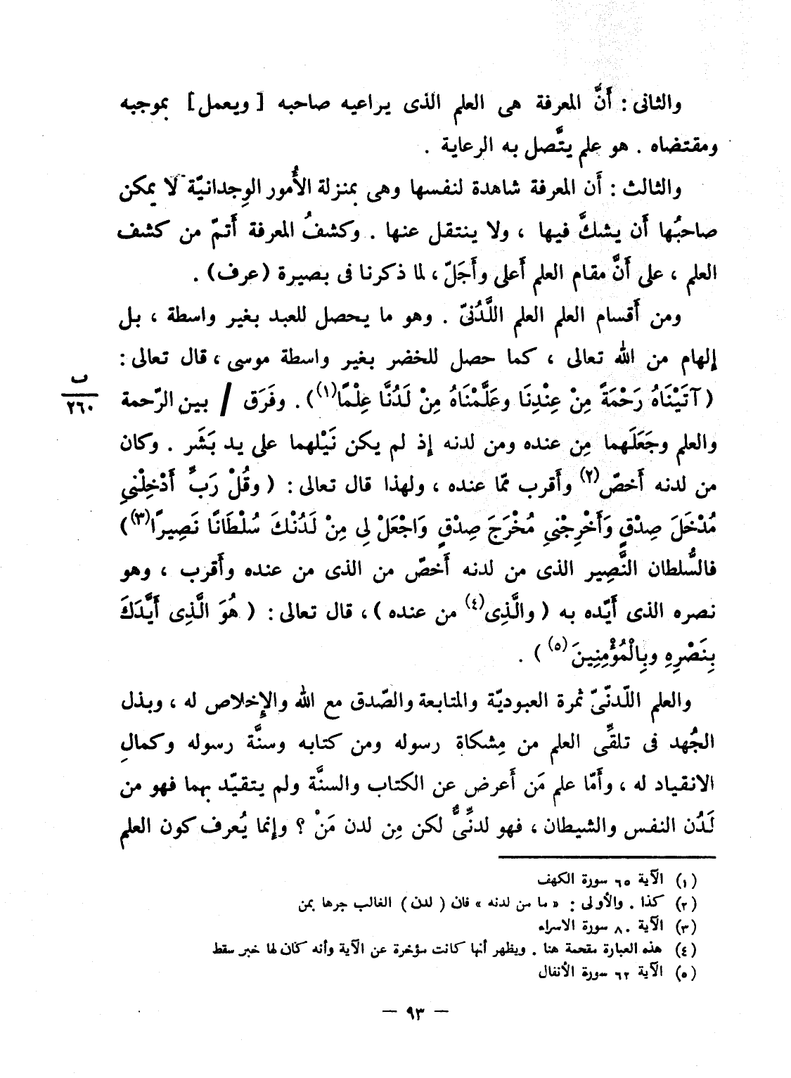 ومن أَقسام العلم العلم اللَّدُنىّ. وهو ما يحصل للعبد بغير واسطة، بل إِلهام من الله تعالى، كما حصل للخضر بغير واسطة موسى، قال تعالى: {آتَيْنَاهُ رَحْمَةً مِّنْ عِندِنَا وَعَلَّمْنَاهُ مِن لَّدُنَّا عِلْماً} . وفَرَق / بين الرّحمة والعلم وجَعَلَهما مِن عنده ومن لدنه إِذ لم يكن نَيْلهما على يد بَشَر. وكان من لدنه أَخصّ وأَقرب ممّا عنده، ولهذا قال تعالى: {وَقُل رَّبِّ أَدْخِلْنِي مُدْخَلَ صِدْقٍ وَأَخْرِجْنِي مُخْرَجَ صِدْقٍ واجعل لِّي مِن لَّدُنْكَ سُلْطَاناً نَّصِيراً} فالسُّلطان النَّصِير الذى من لدنه أَخصّ من الذى من عنده وأَقرب، وهو نصره الذى أَيّده به (والَّذِى من عنده) ، قال تعالى: {هُوَ الذي أَيَّدَكَ بِنَصْرِهِ وبالمؤمنين} .
