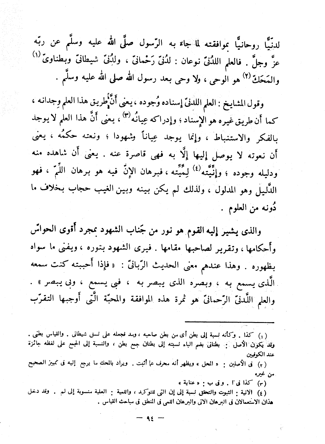 وقول المشايخ: العلم اللدنىّ إِسناده وُجوده، يعنى أَنَّ طريق هذا العلم وِجدانه، كما أَن طريق غيره هو الإِسناد؛ وإِدراكه عِيانُه، بعنى أَنَّ هذا العلم لا يوجد بالفكر والاستنباط، وإِنما يوجد عِياناً وشهودا؛ ونعته حكمُه، يعنى أَن نعوته لا يوصل إِليها إِلاَّ به فهى قاصرة عنه. يعنى أَن شاهده منه ودليله وجوده؛ وإِنِّيَّته لِمِّيِّته، فبرهان الإنّ فيه هو برهان اللِّمّ، فهو الدَّليل وهو المدلول، ولذلك لم يكن بينه وبين الغيب حجاب وبخلاف ما دُونه من العلوم.