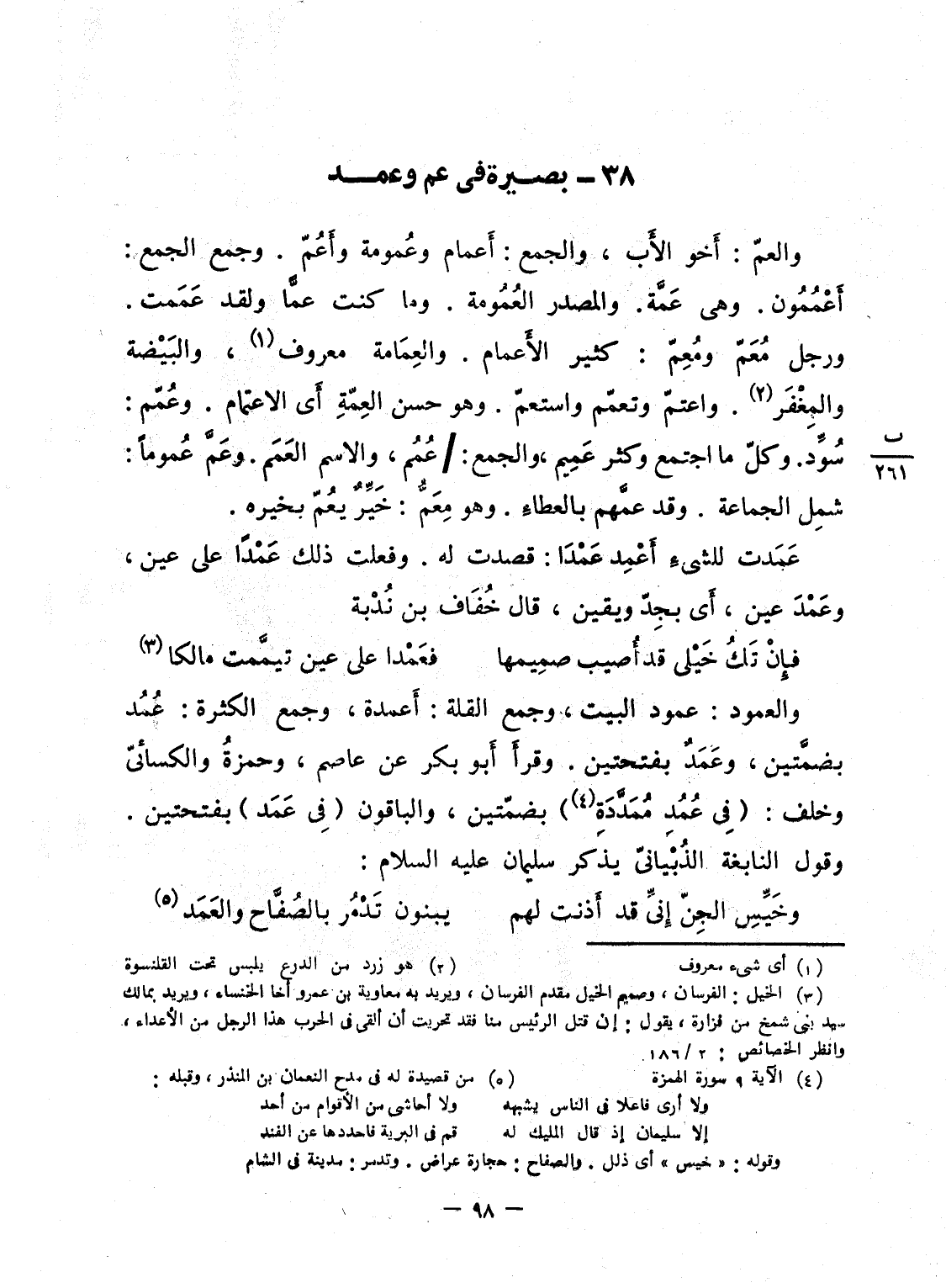 والعمّ: أَخو الأَب، والجمع: أَعمام وعُمومة وأَعُمّ. وجمع الجمع: أَعْمُمُون. وهى عَمَّة. والمصدر العُمُومة. وما كنت عمًّا ولقد عَمَمت. ورجل مُعَمّ ومُعِمّ: كثير الأَعمام. والعِمَامة معروف، والبَيْضة والمِغْفَر. واعتمّ وتعمّم واستعمّ. وهو حسن العِمّةِ أَى الاعتمام. وعُمّم: سُوِّد. وكلّ ما اجتمع وكثر عَمِيم، والجمع: /عُمُم، والاسم العَمَم. وعَمَّ عُموماً: شمِل الجماعة. وقد عمَّهم بالعطاءِ. وهو مِعَمُّ: خَيِّرٌ يعُمّ بخيره..