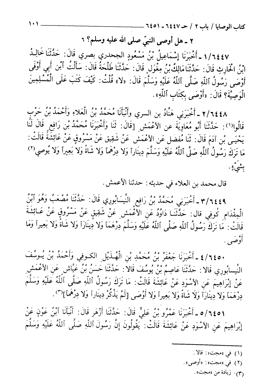 6447 - أخبرنا إسماعيل بن مسعود الجحدري بصري قال حدثنا خالد بن الحارث قال حدثنا مالك بن مغول قال حدثنا طلحة قال : سألت بن أبي أوفى أوصى رسول الله صلى الله عليه و سلم قال لا قلت كيف كتب على المسلمين الوصية قال أوصى بكتاب الله
