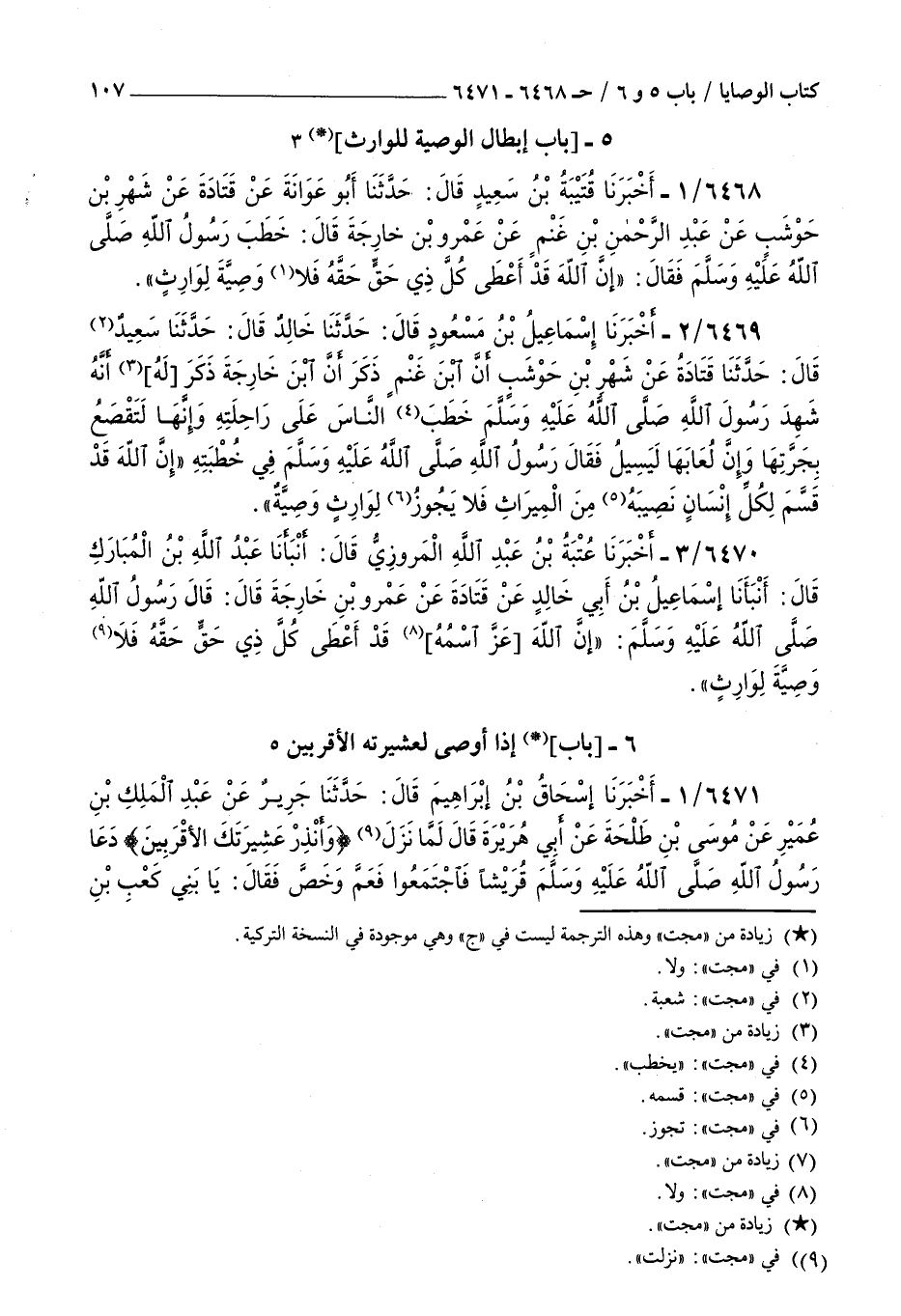 6468 - أخبرنا قتيبة بن سعيد قال حدثنا أبو عوانة عن قتادة عن شهر بن حوشب عن عبد الرحمن بن غنم عن عمرو بن خارجة قال خطب رسول الله صلى الله عليه و سلم فقال : إن الله قد أعطى كل ذي حق حقه فلا وصية لوارث