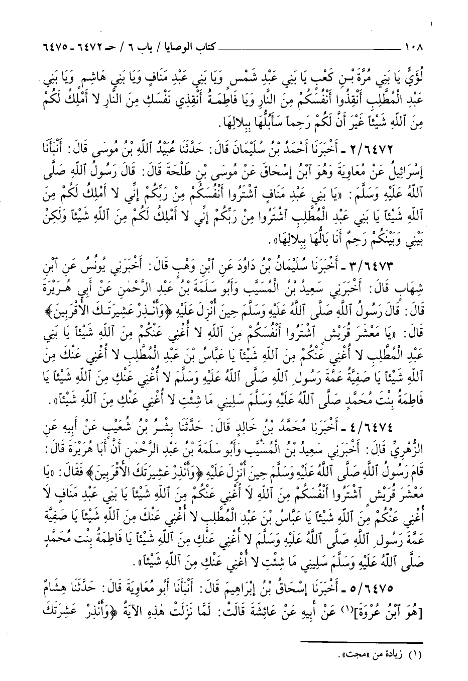 6474 - أخبرنا محمد بن خالد قال حدثنا بشر بن شعيب عن أبيه عن الزهري قال أخبرني سعيد بن المسيب وأبو سلمة بن عبد الرحمن أن أبا هريرة قال : قام رسول الله صلى الله عليه و سلم حين أنزل عليه وأنذر عشيرتك الأقربين فقال يا معشر قريش اشتروا أنفسكم من الله لا أغني عنكم من الله شيئا يا بني عبد مناف لا أغني عنكم من الله شيئا يا عباس بن عبد المطلب لا أغني عنك من الله شيئا يا صفية عمة رسول الله صلى الله عليه و سلم لا أغني عنك من الله شيئا يا فاطمة بنت محمد صلى الله عليه و سلم سليني ما شئت لا أغني عنك من الله شيئا