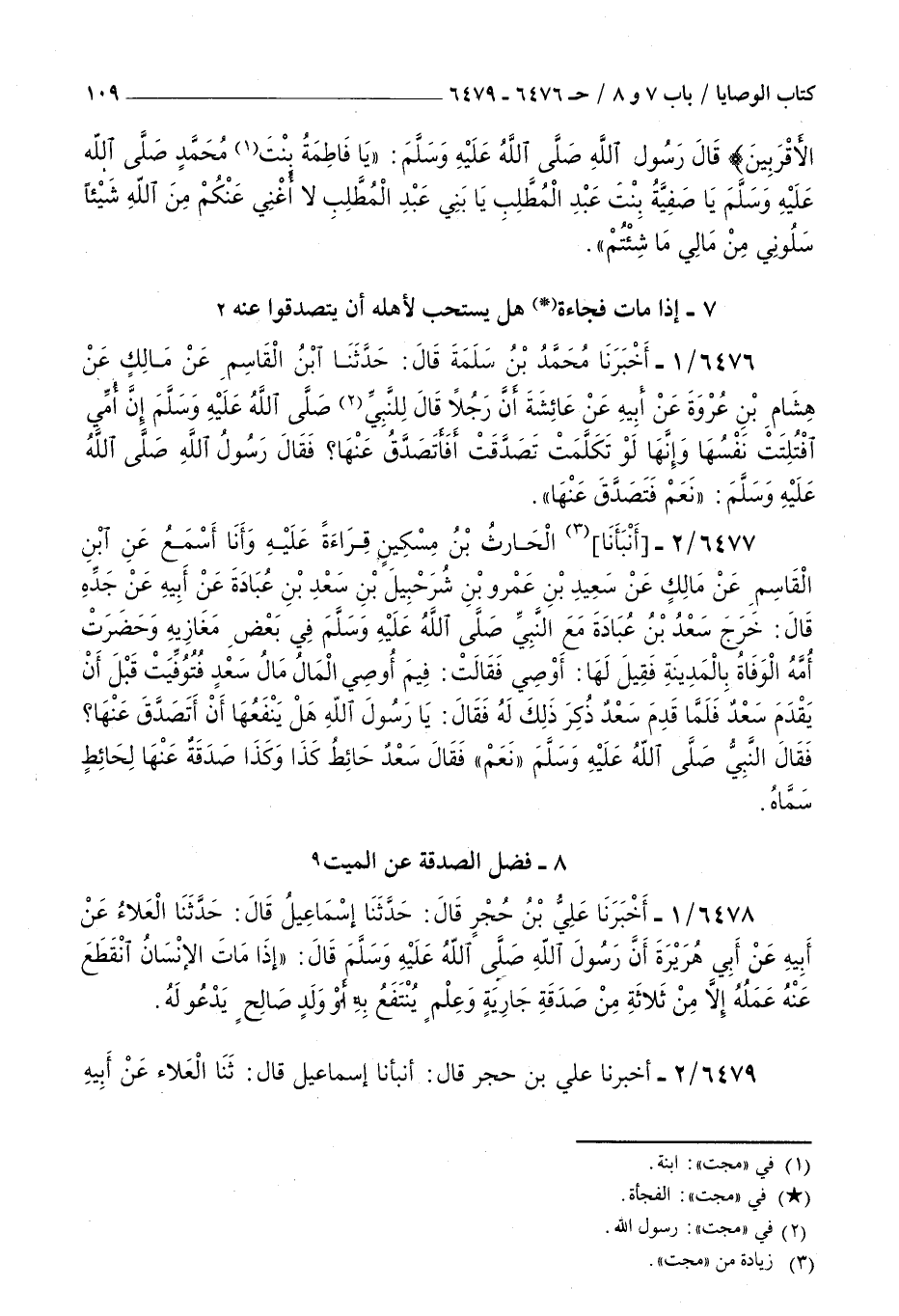 6478 - أخبرنا علي بن حجر قال حدثنا إسماعيل قال حدثنا العلاء عن أبيه عن أبي هريرة أن رسول الله صلى الله عليه و سلم قال : إذا مات الإنسان انقطع عنه عمله إلا من ثلاثة من صدقة جارية وعلم ينتفع به أو ولد صالح يدعو له