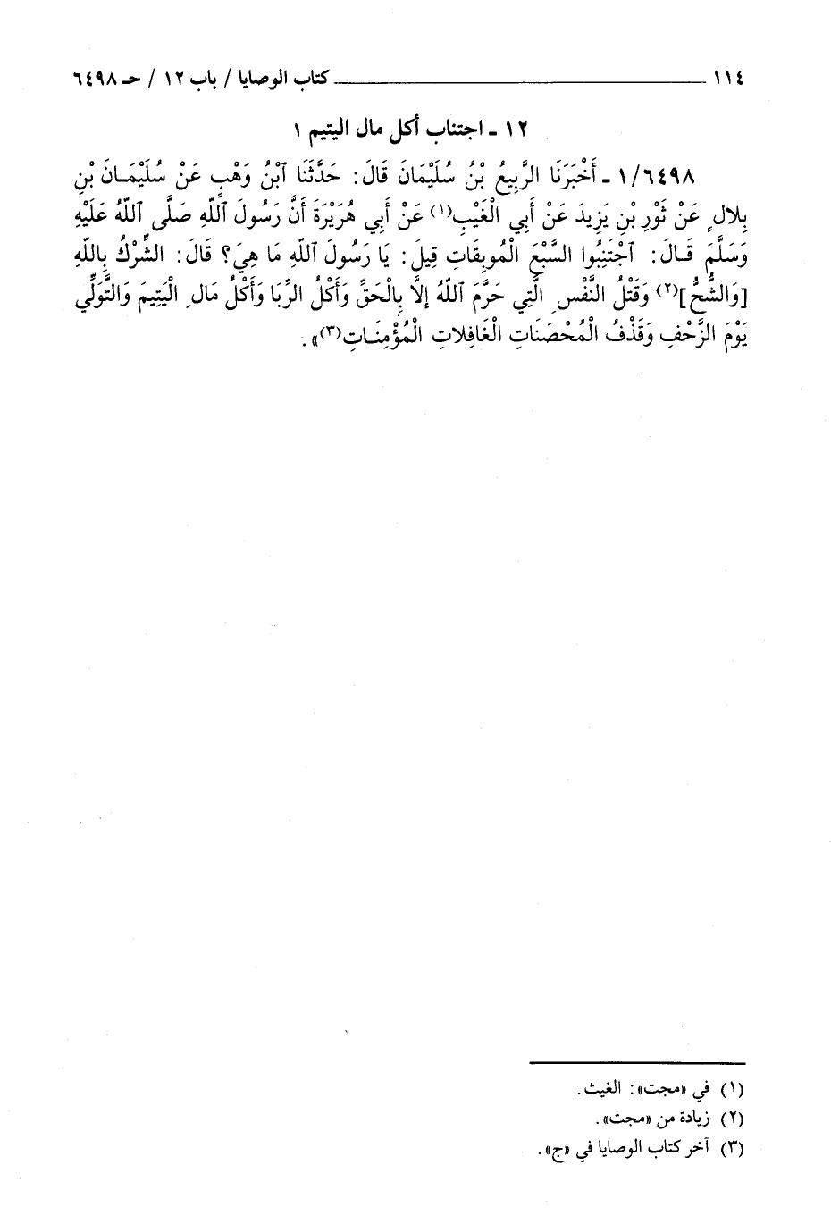 6498 - أخبرنا الربيع بن سليمان قال حدثنا بن وهب عن سليمان بن بلال عن ثور بن يزيد عن أبي الغيب عن أبي هريرة أن رسول الله صلى الله عليه و سلم قال : اجتنبوا السبع الموبقات قيل يا رسول الله ما هي قال الشرك بالله والشح وقتل النفس التي حرم الله إلا بالحق وأكل الربا وأكل مال اليتيم والتولي يوم الزحف وقذف المحصنات الغافلات المؤمنات بسم الله الرحمن الرحيم وصلى الله على سيدنا محمد وعلى آله وصحبه وسلم