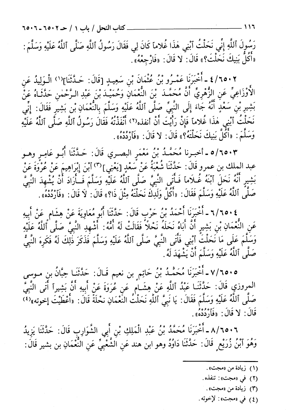 6504 - أخبرنا أحمد بن حرب قال حدثنا أبو معاوية عن هشام عن أبيه عن النعمان بن بشر : أن أباه نحله نحلا فقالت له أمه أشهد النبي صلى الله عليه و سلم على ما نحلت ابني فأتى النبي صلى الله عليه و سلم فذكر ذلك له فكره النبي صلى الله عليه و سلم أن يشهد له