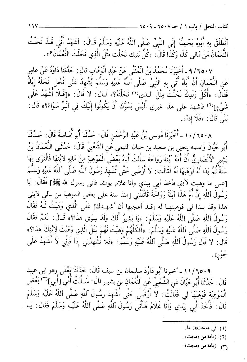 6507 - أخبرنا محمد بن المثنى عن عبد الوهاب قال حدثنا داود عن عامر عن النعمان : أن أباه أتى به النبي صلى الله عليه و سلم يشهد على نحل نحله إياه فقال أكل ولدك نحلت مثل الذي نحلته قال لا قال فلا اشهد على شيء فأشهد على هذا غيري أليس يسرك أن يكونوا إليك في البر سواء قال بلى قال فلا إذا