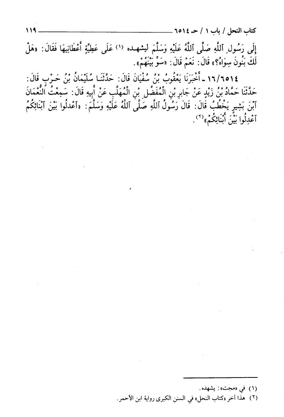 6514 - أخبرنا يعقوب بن سفيان قال حدثنا سليمان بن حرب قال حدثنا حماد بن زيد عن جابر بن المفضل بن المهلب عن أبيه قال سمعت النعمان بن بشير يخطب قال قال رسول الله صلى الله عليه و سلم : اعدلوا بين أبنائكم اعدلوا بين أبنائكم