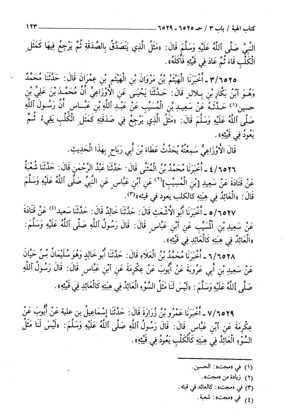 6525 - أخبرنا الهيثم بن مروان بن الهيثم بن عمران قال حدثنا محمد وهو بن بكار بن بلال قال حدثنا يحيى عن الأوزاعي أن محمد بن علي بن حسين حدثه عن سعيد بن المسيب عن عبد الله بن عباس أن رسول الله صلى الله عليه و سلم قال : مثل الذي يرجع في صدقته كمثل الكلب يقيء ثم يعود في قيئه قال الأوزاعي سمعته يحدث عطاء بن أبي رباح بهذا الحديث