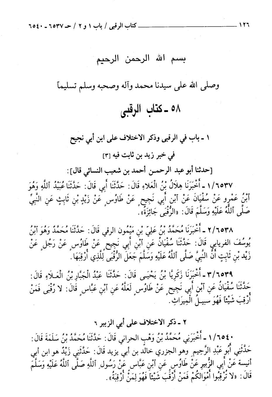6540 - أخبرني محمد بن وهب الحراني قال حدثنا محمد بن سلمة قال حدثني أبو عبد الرحيم وهو الجزري خالد بن أبي يزيد قال حدثني زيد هو بن أبي أنيسة عن أبي الزبير عن طاوس عن بن عباس عن رسول الله صلى الله عليه و سلم قال : لا ترقبوا أموالكم فمن أرقب شيئا فهو لمن أرقبة
