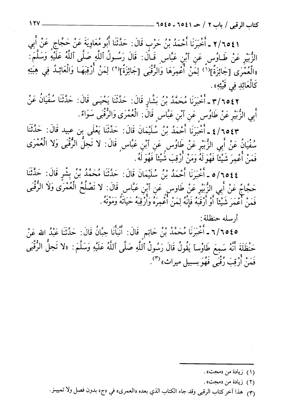 6545 - أخبرنا محمد بن حاتم قال أنبأنا حبان قال حدثنا عبد الله عن حنظلة أنه سمع طاوسا يقول قال رسول الله صلى الله عليه و سلم : لا تحل الرقبى فمن أرقب رقبى فهو بسبيل ميراث [ ص 128 ] بسم الله الرحمن الرحيم