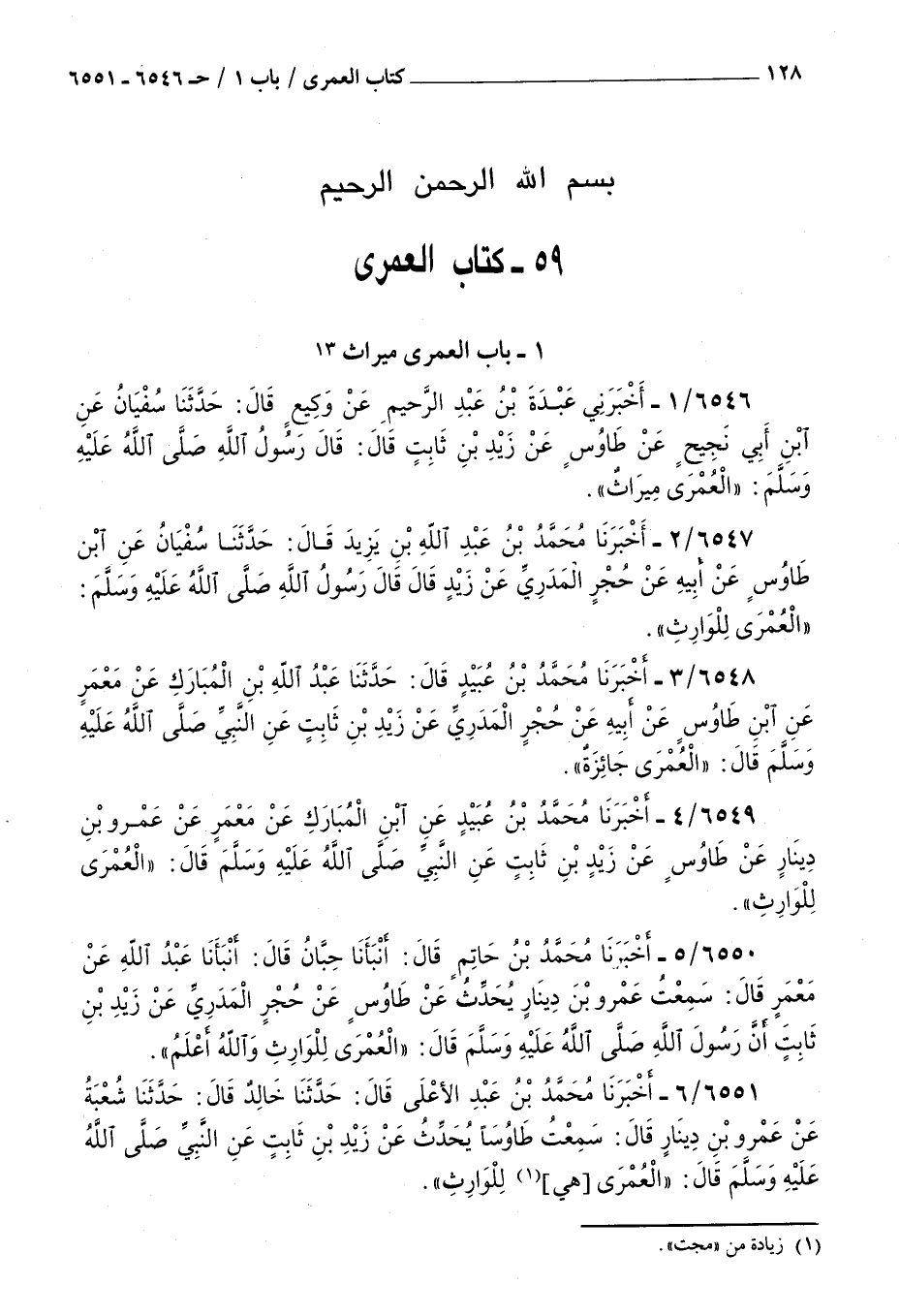 6546 - أخبرني عبدة بن عبد الرحيم عن وكيع قال حدثنا سفيان عن بن أبي نجيح عن طاوس عن زيد بن ثابت قال قال رسول الله صلى الله عليه و سلم : العمرى ميراث