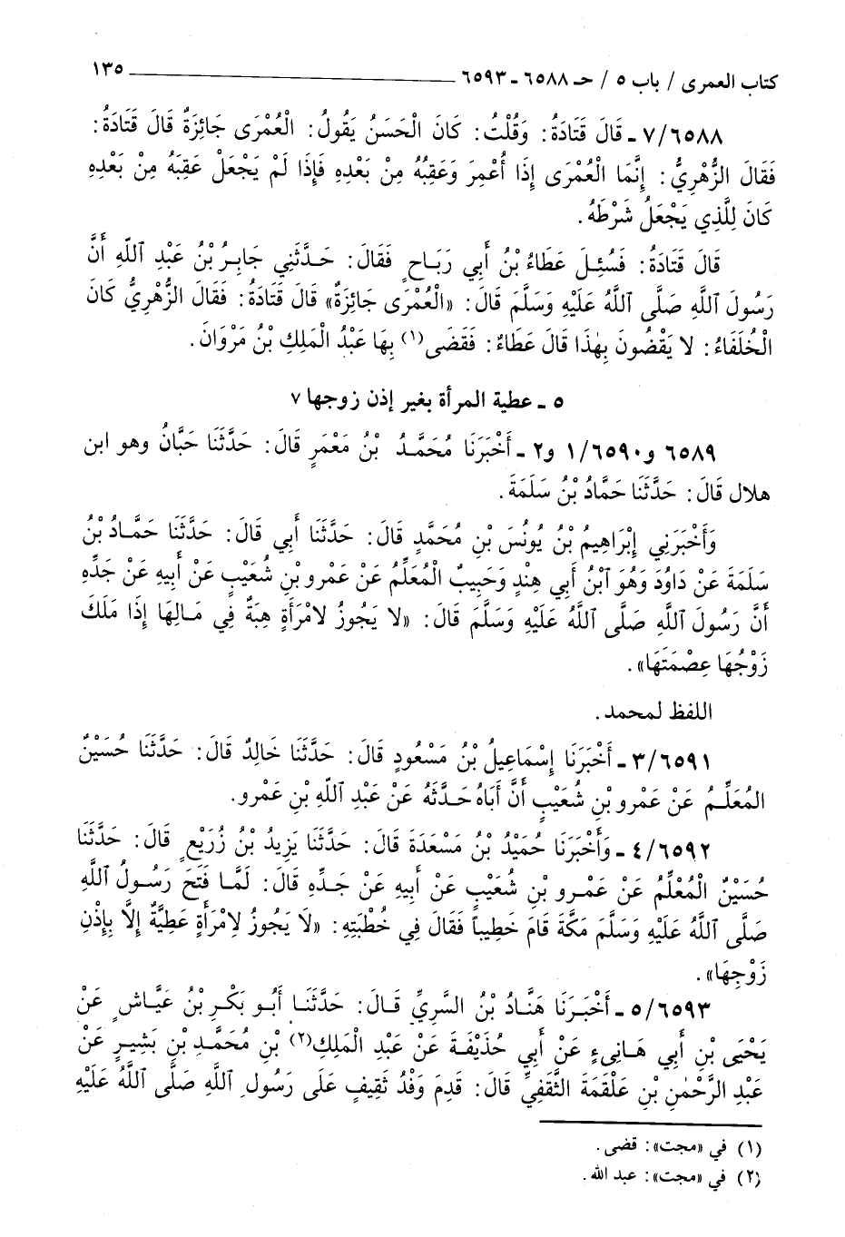 6590 - أخبرنا محمد بن معمر قال حدثنا حبان وهو بن هلال قال حدثنا حماد بن سلمة وأخبرني إبراهيم بن يونس بن محمد قال حدثنا أبي قال حدثنا حماد بن سلمة عن داود وهو بن أبي هند وحبيب المعلم عن عمرو بن شعيب عن أبيه عن جده أن رسول الله صلى الله عليه و سلم قال : لا يجوز لامرأة هبة في مالها إذا ملك زوجها عصمتها اللفظ لمحمد