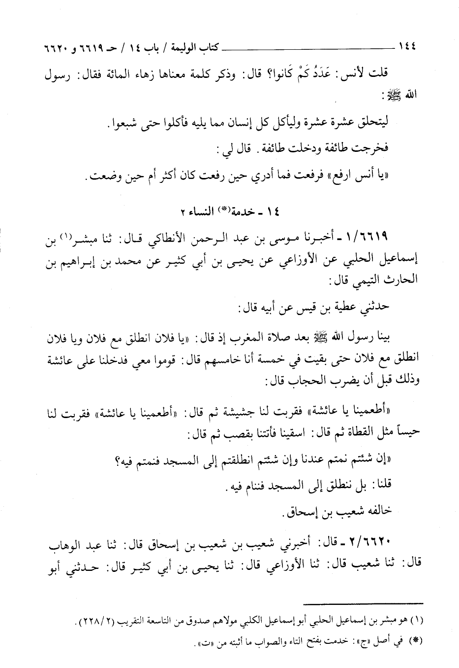6619 - أخبرنا موسى بن عبد الرحمن الأنطاكي قال ثنا مبشر بن إسماعيل الحلبي عن الأوزاعي عن يحيى بن أبي كثير عن محمد بن إبراهيم بن الحارث التيمي قال حدثني عطية بن قيس عن أبيه قال : بينا رسول الله صلى الله عليه و سلم بعد صلاة المغرب إذ قال يا فلان انطلق مع فلان ويا فلان انطلق مع فلان حتى بقيت في خمسة أنا خامسهم قال قوموا معي فدخلنا على عائشة وذلك قبل أن يضرب الحجاب قال أطعمينا يا عائشة فقربت لنا جشيشة ثم قال أطعمينا يا عائشة فقربت لنا حيسا مثل القطاة ثم قال اسقينا فأتتنا بقصب ثم قال إن شئتم نمتم عندنا وإن شئتم انطلقتم إلى المسجد فنمتم فيه قلنا بل ننطلق إلى المسجد فننام فيه خالفة شعيب بن إسحاق